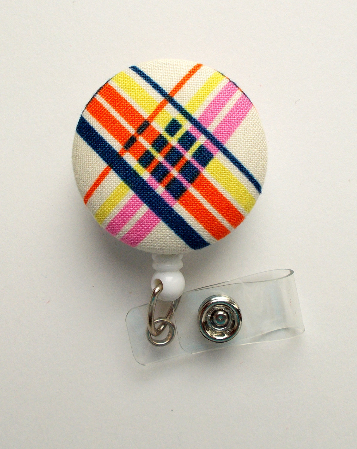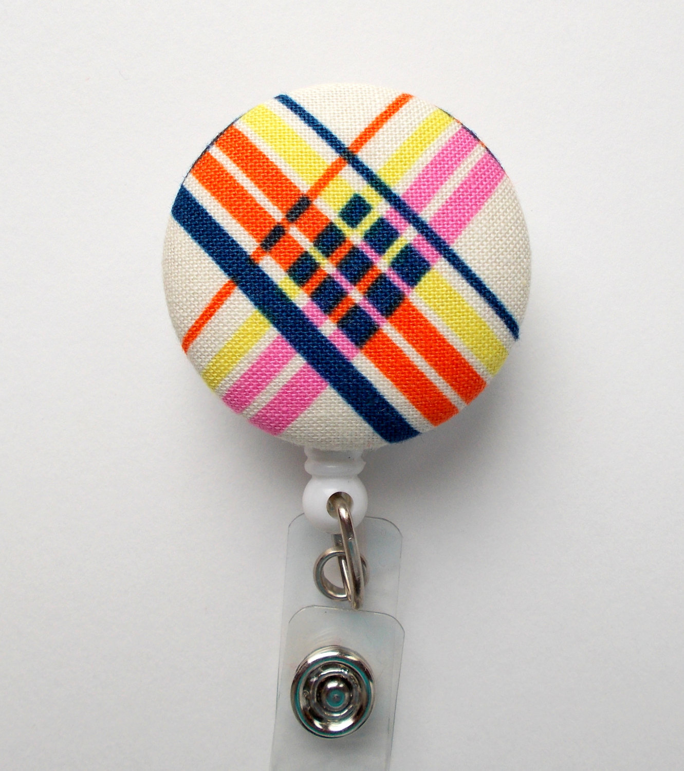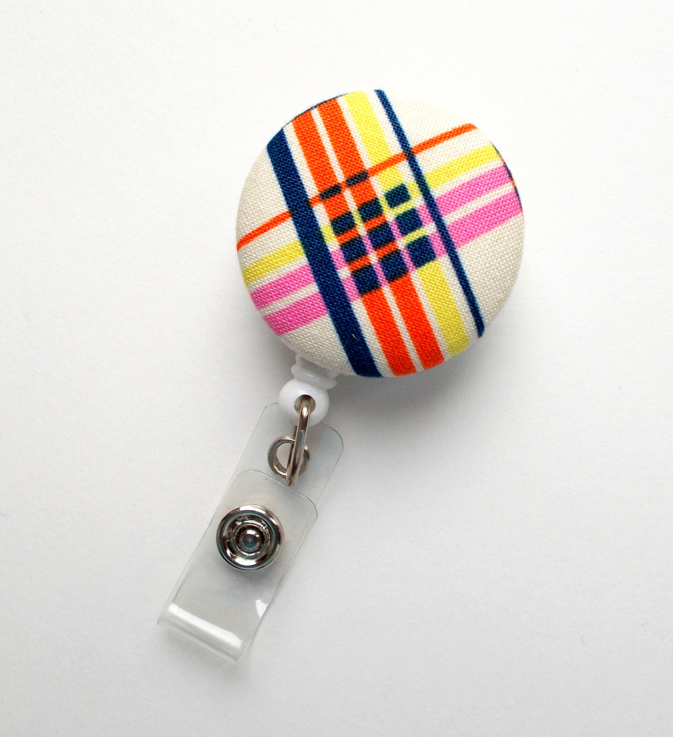 This ID badge reel features a colorful plaid fabric covered button. Button sits on a white, hard plastic badge reel.