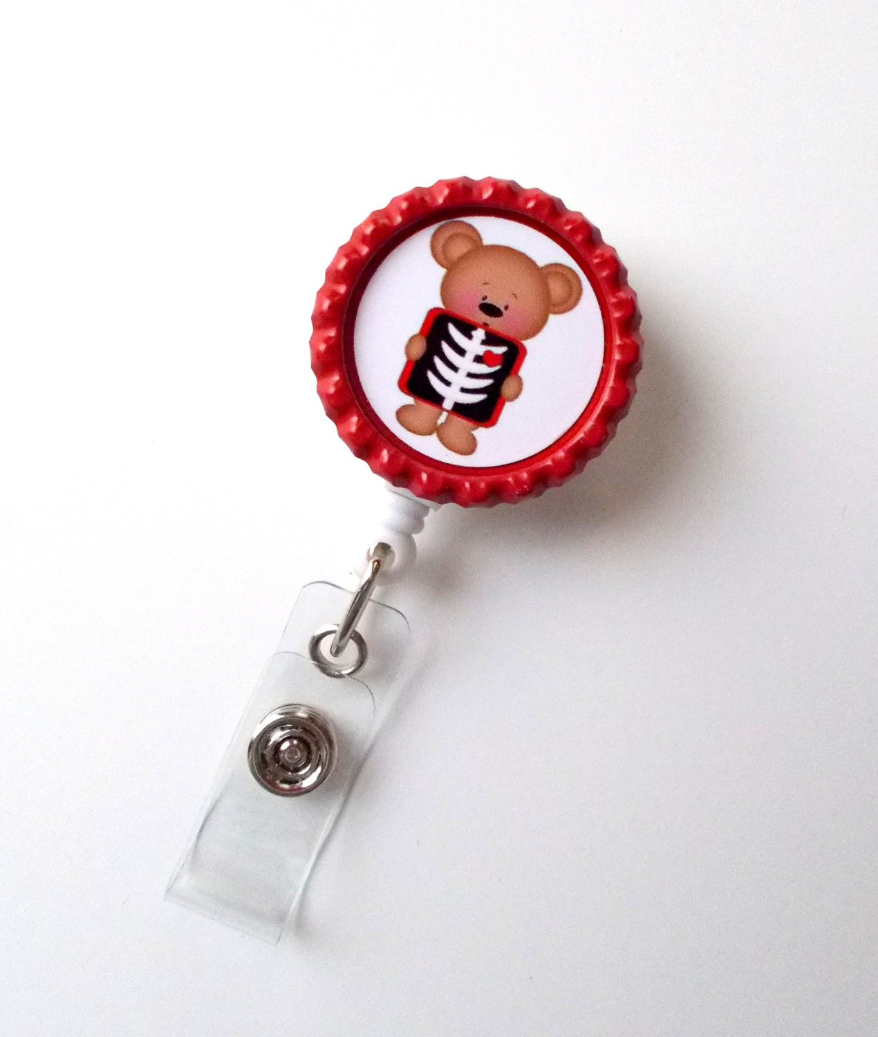 Super cute Xray Bear on a red bottlecap. Sits on a sturdy white hard plastic badge reel.