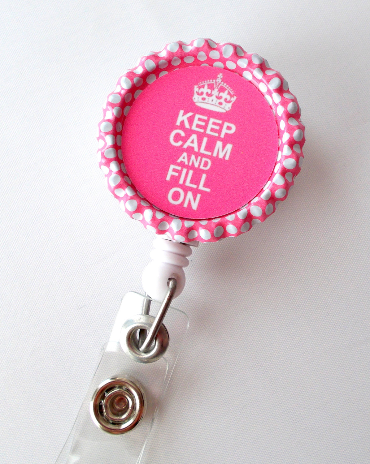 Keep Calm and Fill On Pink Crown ID Badge holder set on a pink and white polka dot bottle cap. Super cute and sure to brighten your day!