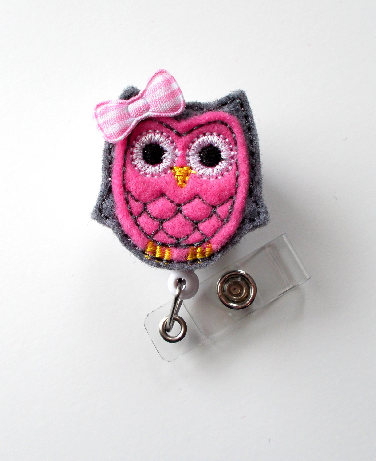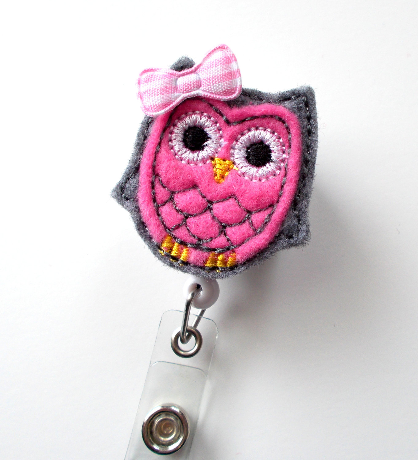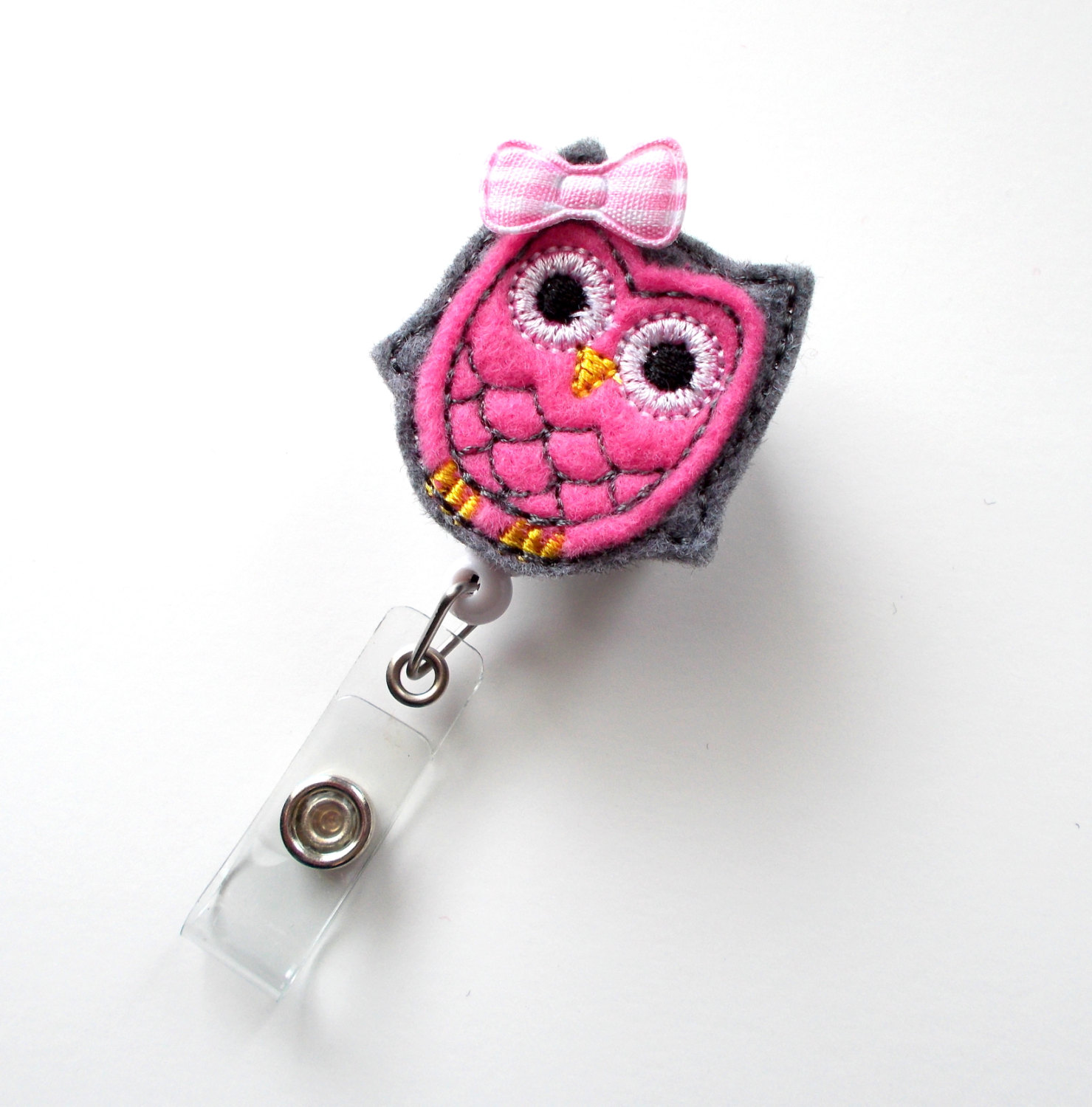 Pink and Gray Owl with bow - Cute Badge Holder - Nurses Badge Holder - Felt Badge - Nursing Badge Holder - Cute Badge Reel - RN Badge Reel