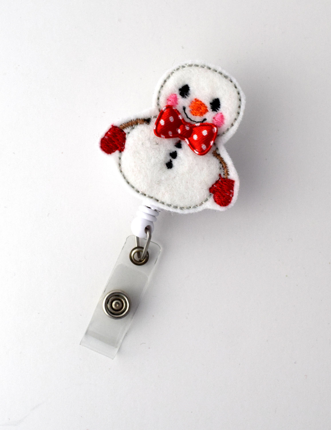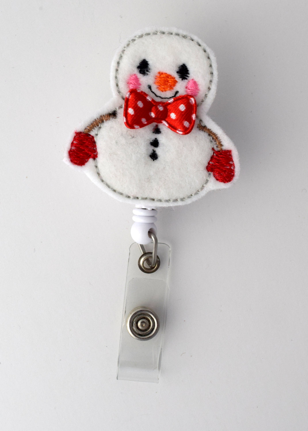This retractable ID felt badge holder features a snowman felt applique, accented with a red and white polka dot bow.