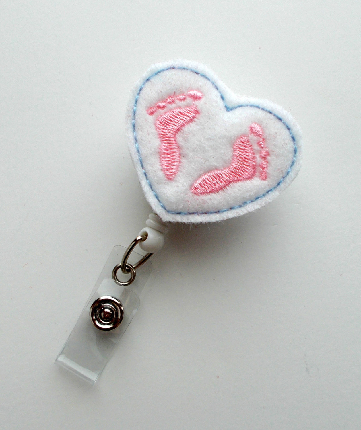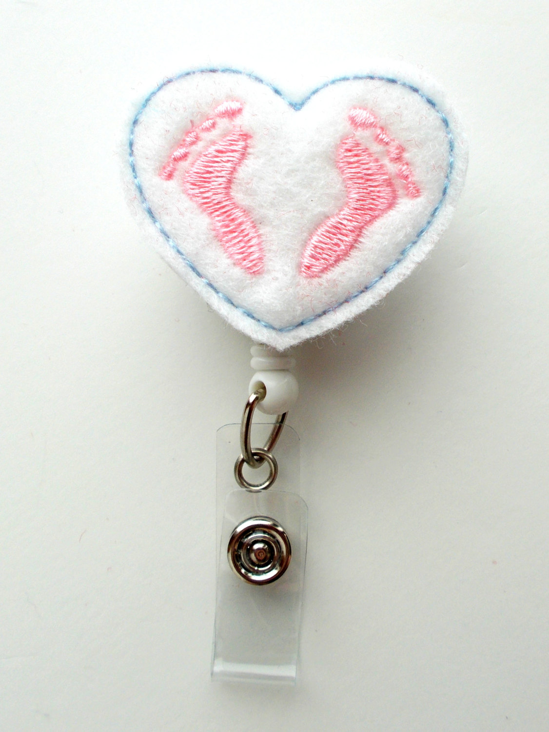 This retractable ID felt badge holder features a felt applique white heart outlined in baby blue featuring baby pink feet in the middle of the heart.