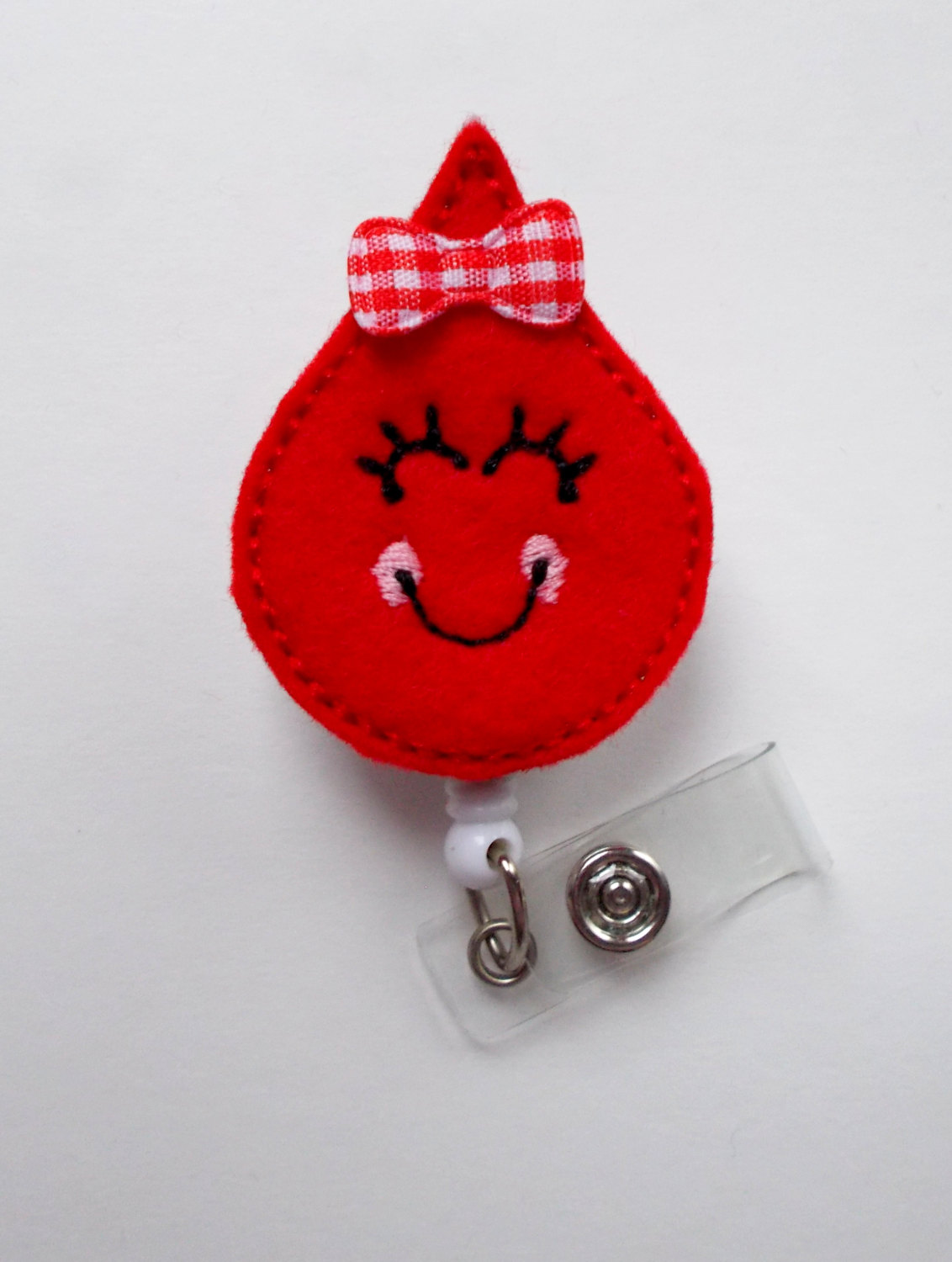 This retractable ID felt badge holder features a smiling blood drop felt applique and can be accented with a red and white gingham checked bow. Felt applique sits on a white, hard plastic badge reel.