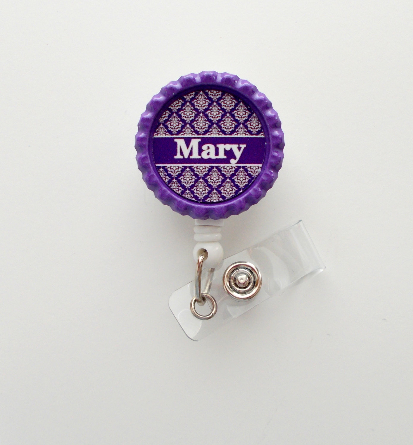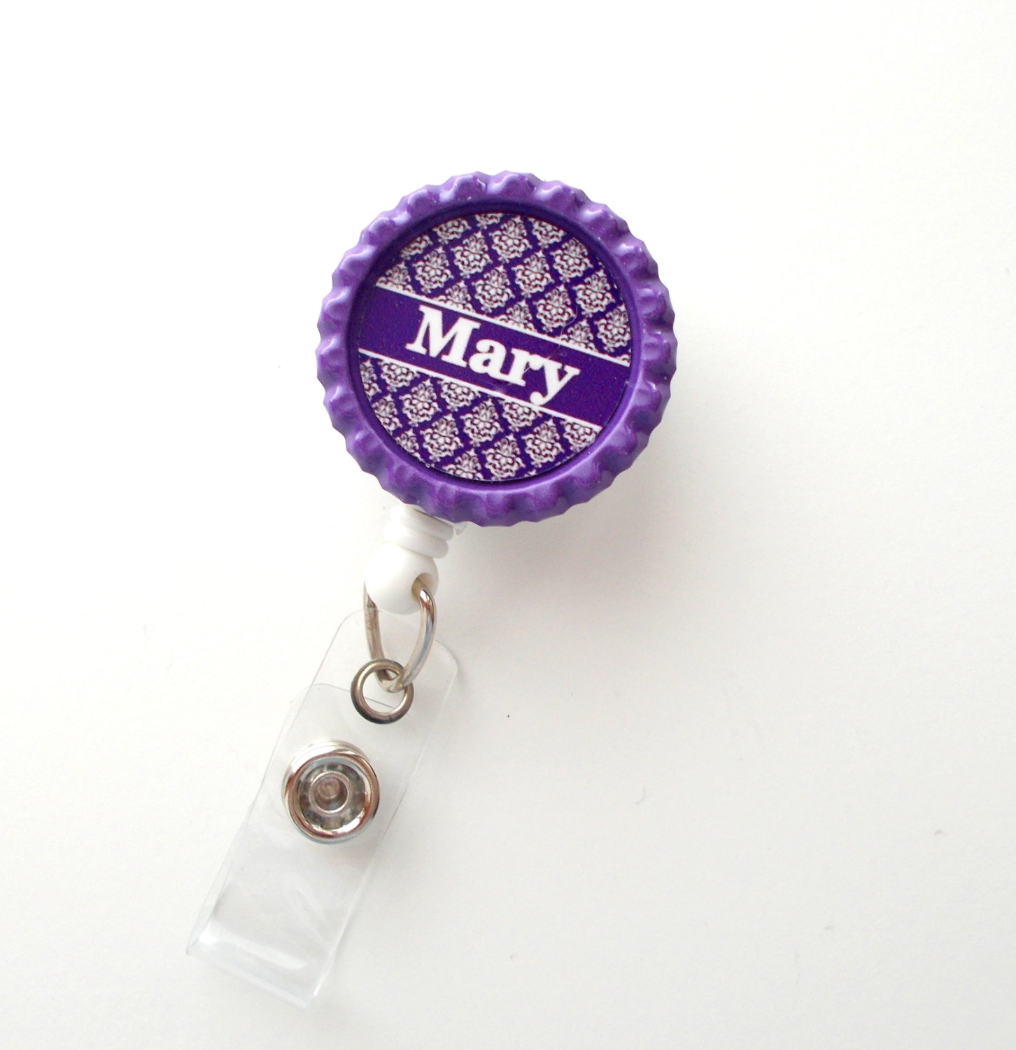 This badge can be personalized with your name or initials. It features a purple and white damask pattern with a purple accent for your name or initials. Graphic is sealed with an epoxy sealant and sits on a purple bottle cap. Bottle cap is glued to a white hard plastic badge reel.