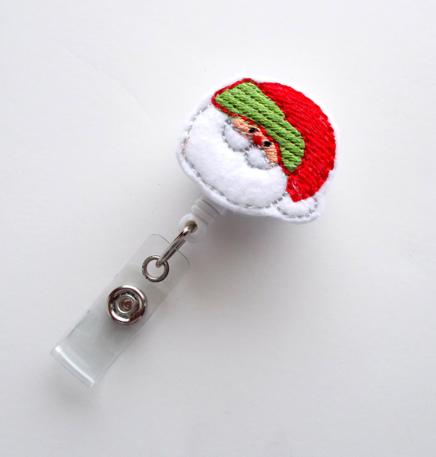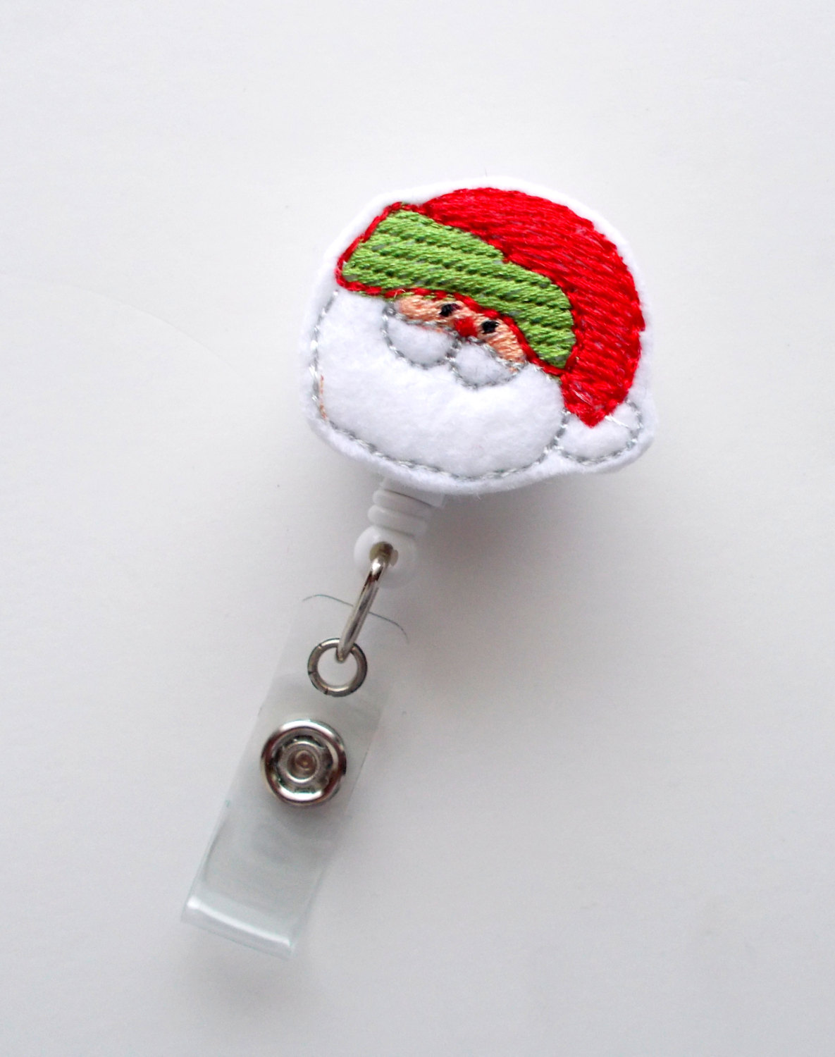 This retractable ID felt badge holder features a Santa Claus applique with a red hat trimmed in green. Attached to a white retractable badge reel.