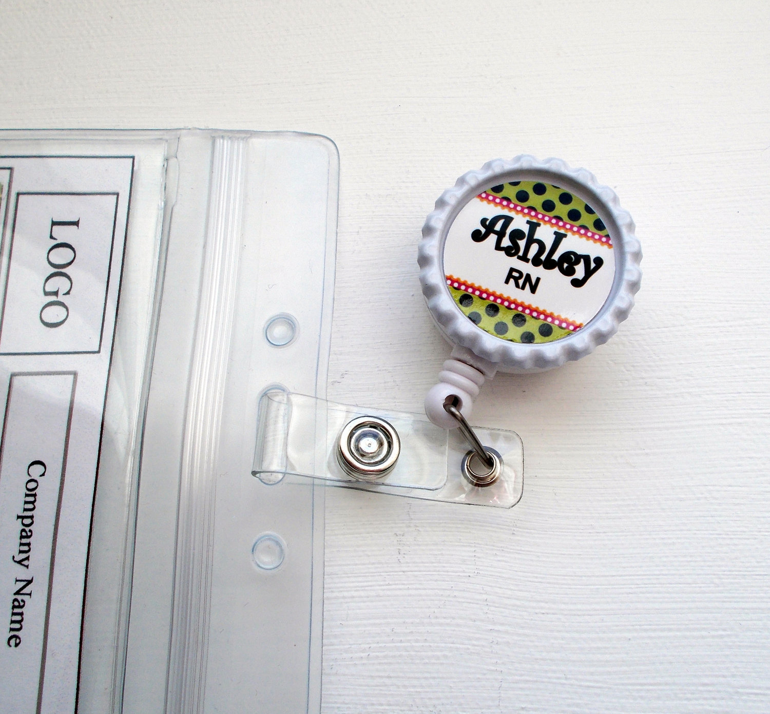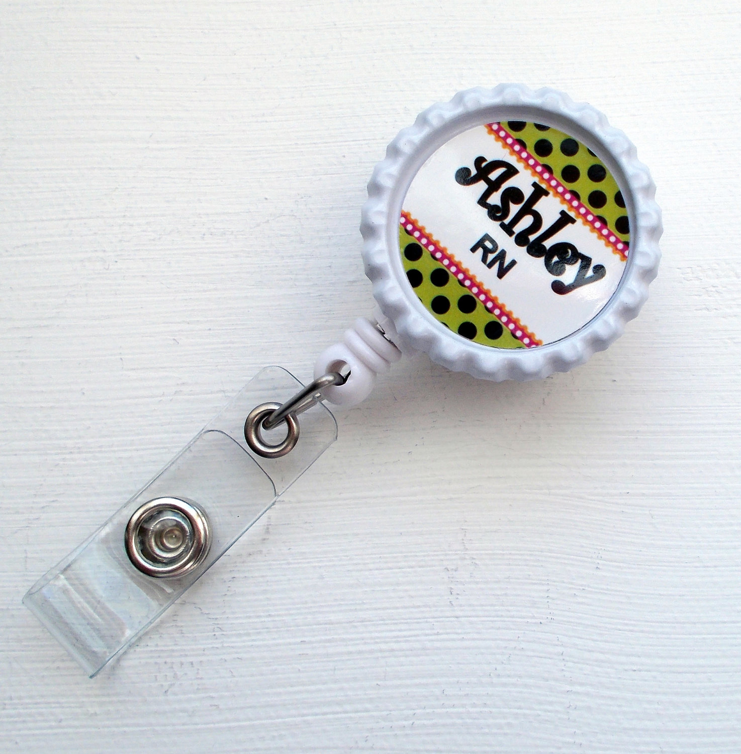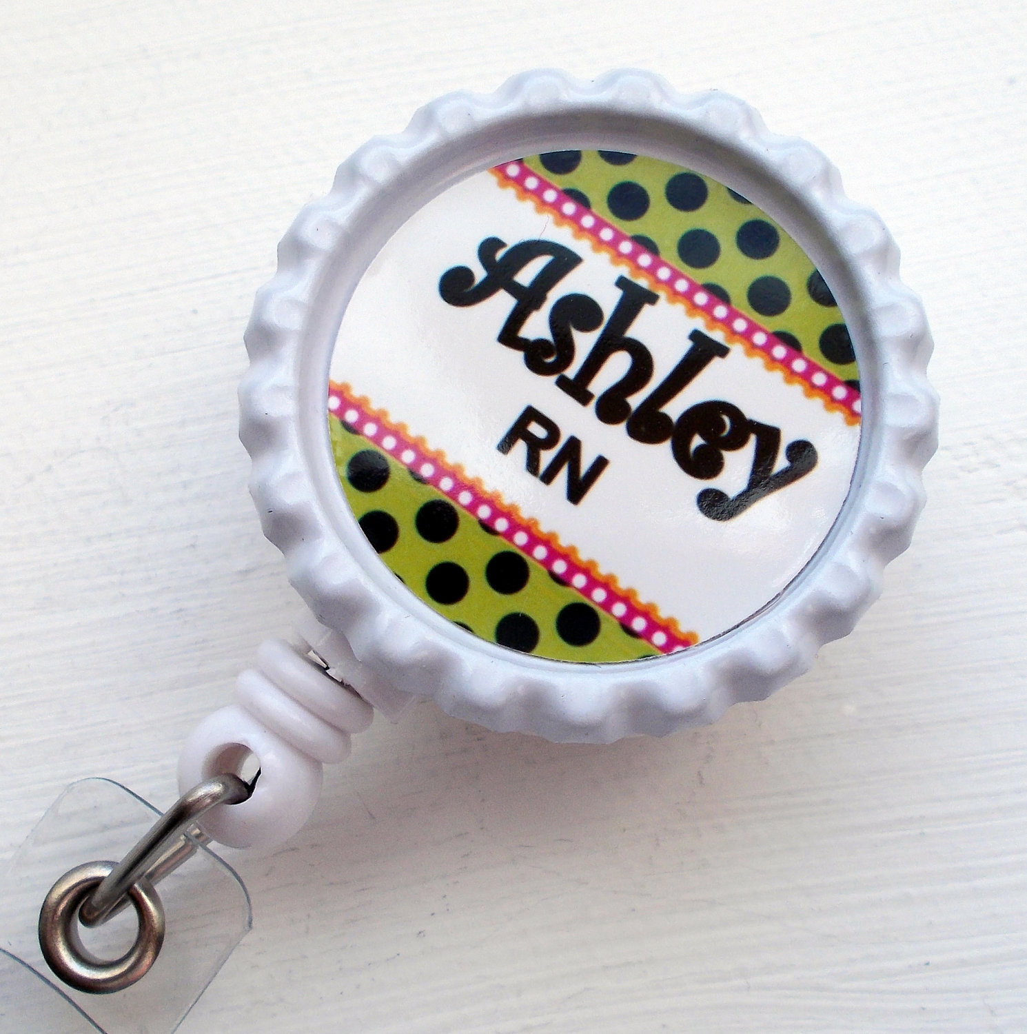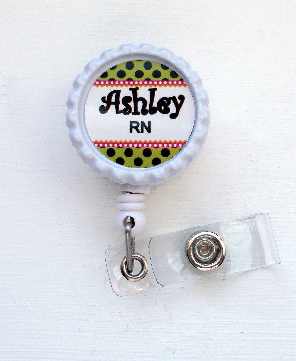 This is a personalized RN ID badge holder featuring a lime green polka dot graphic on a white bottle cap. Please indicate the name and initials in a message. If you prefer only the name please indicate in a message your exact specifications.
