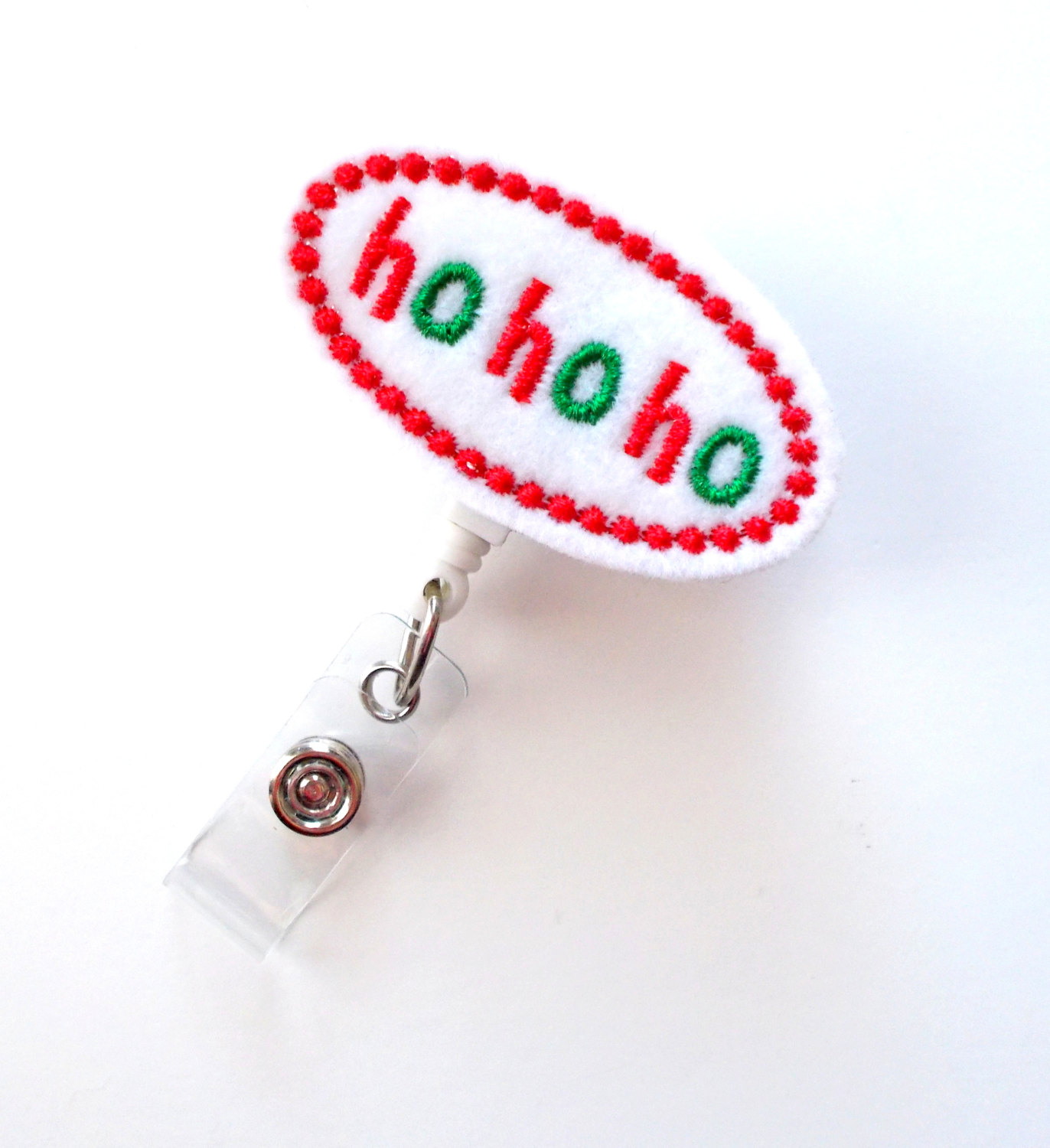This retractable ID felt badge holder features the words "Ho-Ho-Ho on white felt applique. Words are embroidered in red and green. Perfect for holiday season.