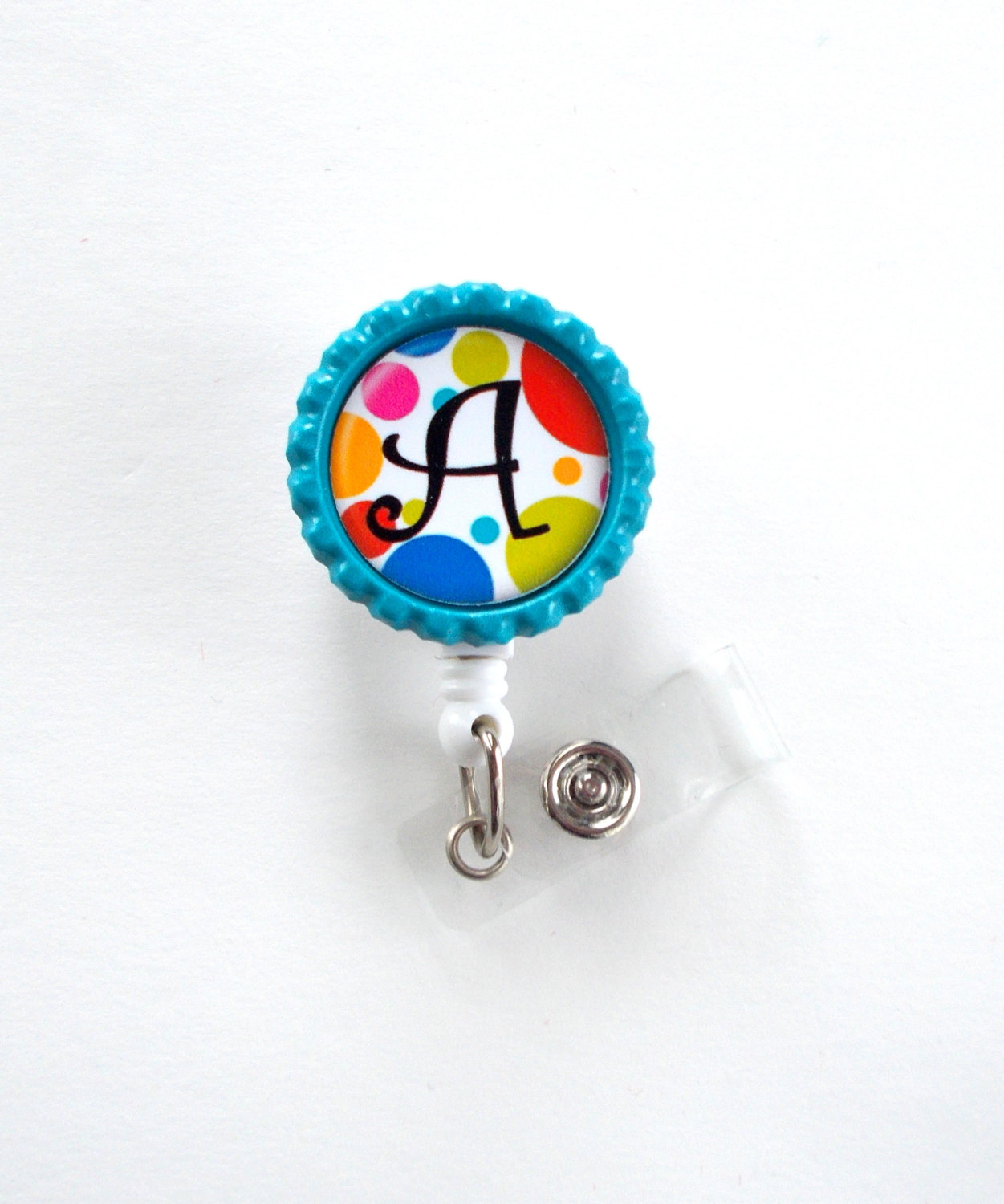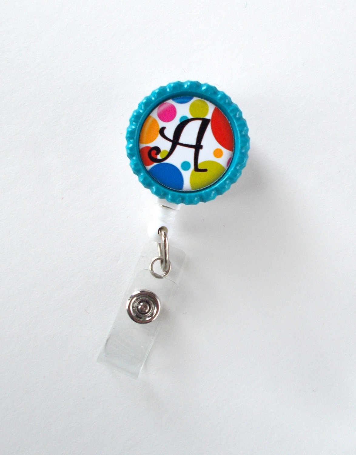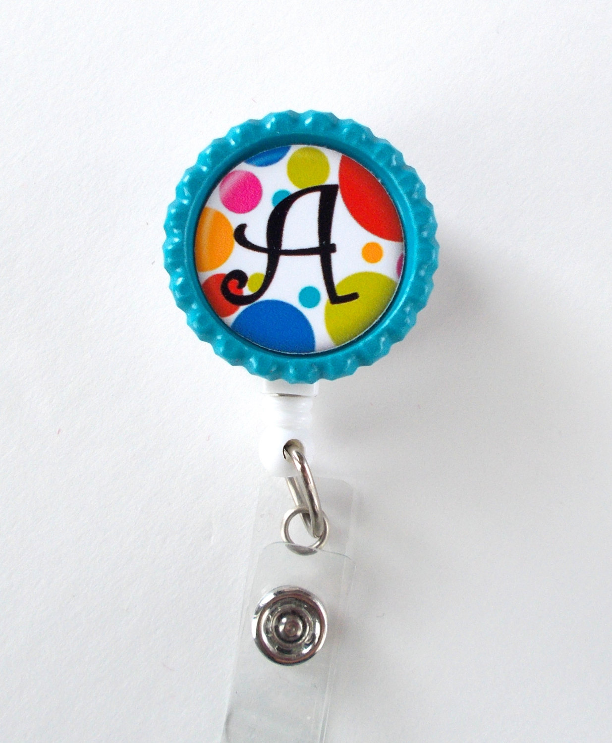 This badge features a colorful polka dot pattern with your choice of personalization. Graphic sits on a blue bottle cap. Graphic is sealed with an epoxy sealant. You may wipe the graphic with a damp cloth to clean it but it is not waterproof. The bottle cap is glued to a white, hard plastic badge reel.