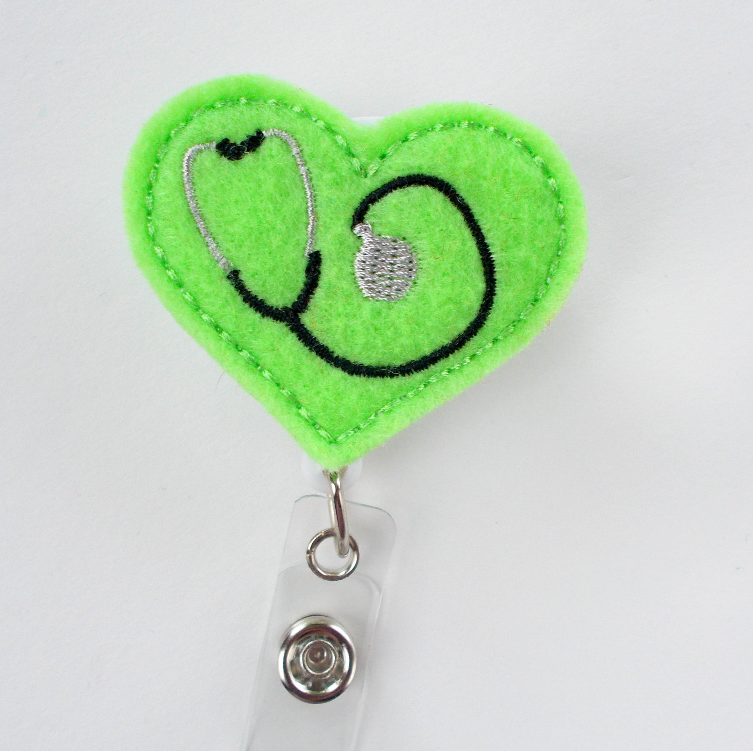 Stethoscope Heart Green - Badge Reel - Medical Badge Holder - RN Badge Reel - Pediatric Nurse Badge Holder - Nursing Badge Clip - Felt Badge