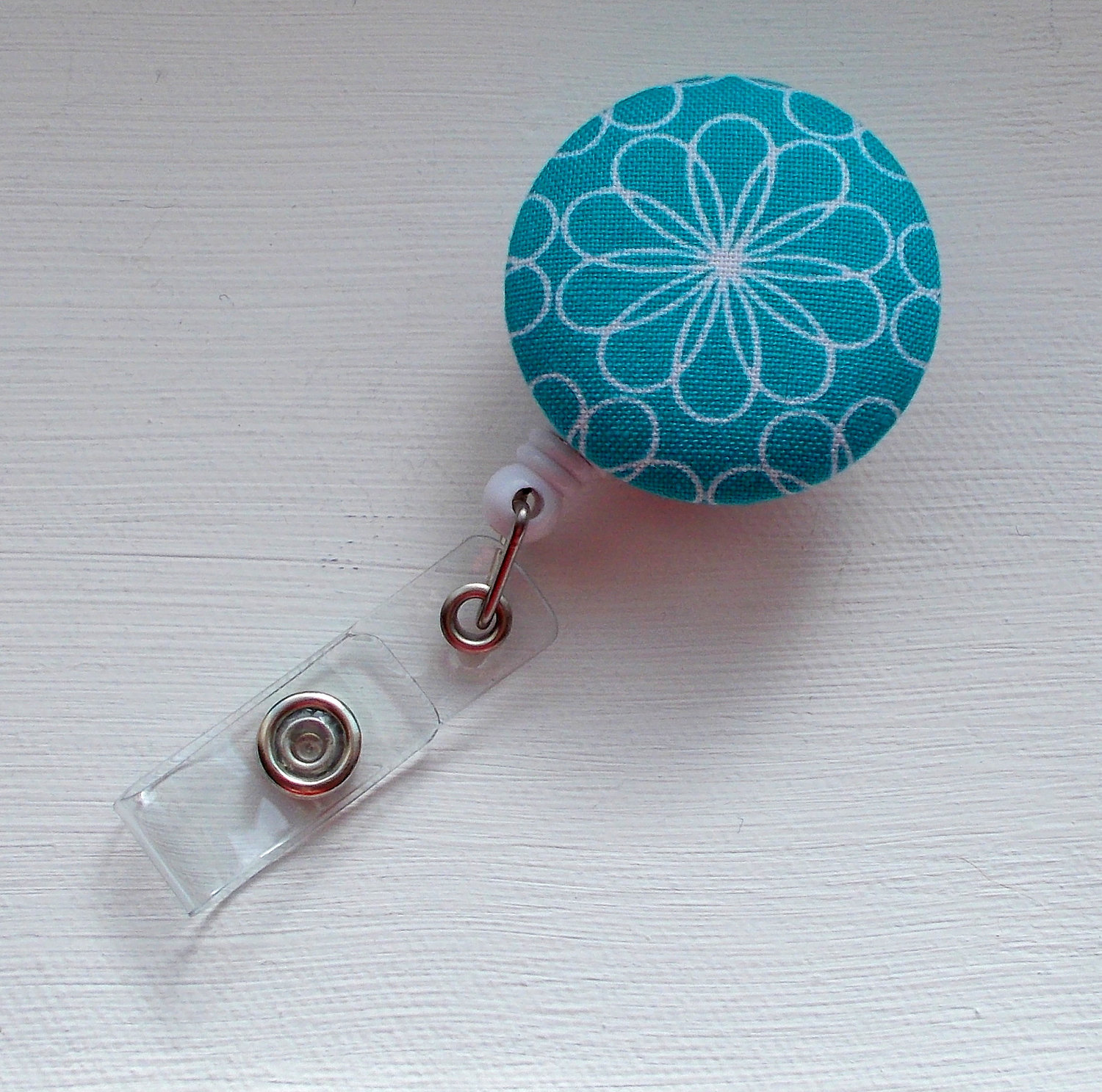 This ID badge is super cute! The fabric features a white daisy on blue fabric. Sits on a white, hard plastic badge reel.