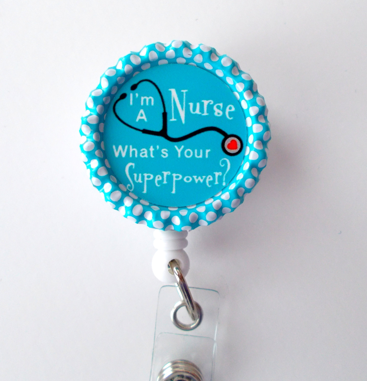 I'm a Nurse What's Your SuperPower aqua badge holder. Graphic is glued to a blue and white polka dot bottle cap. Graphic is sealed with an epoxy sealant. Sits on a sturdy white plastic badge reel.