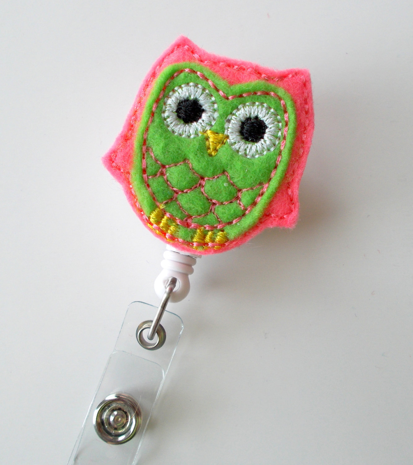This retractable ID felt badge holder features a lime green and pink owl felt applique.