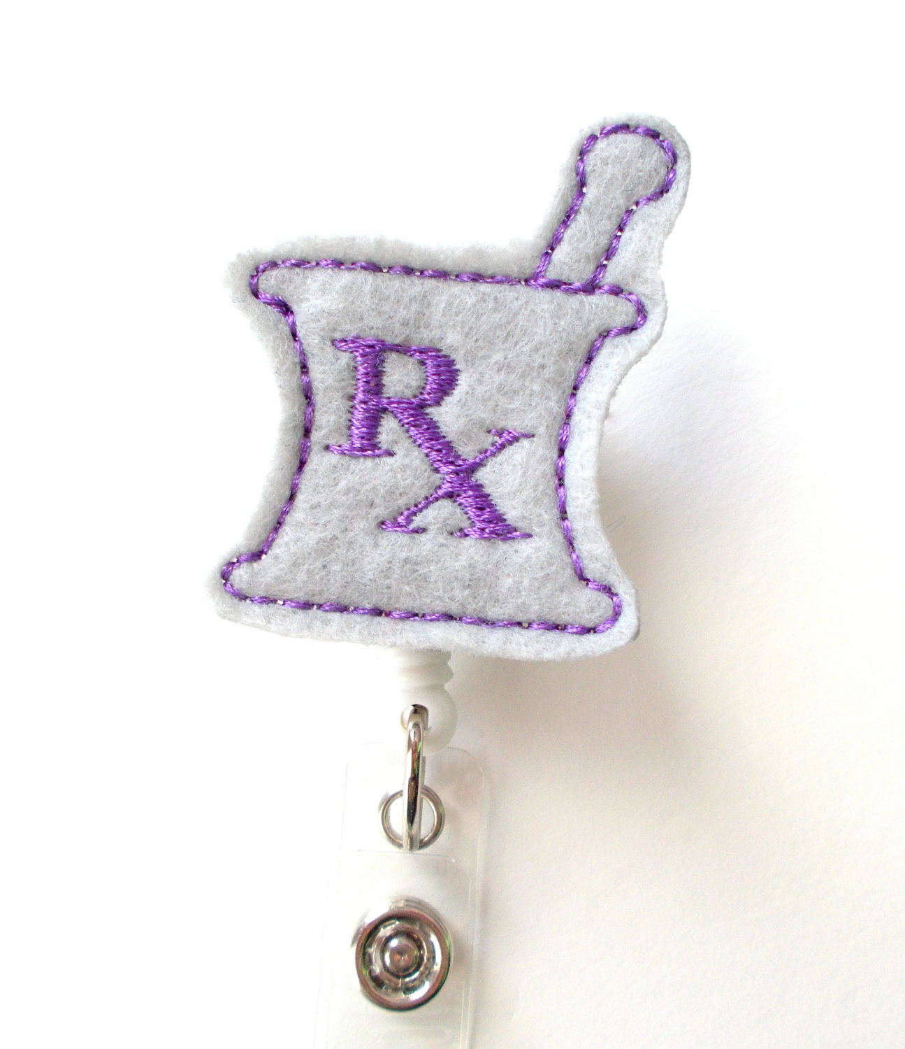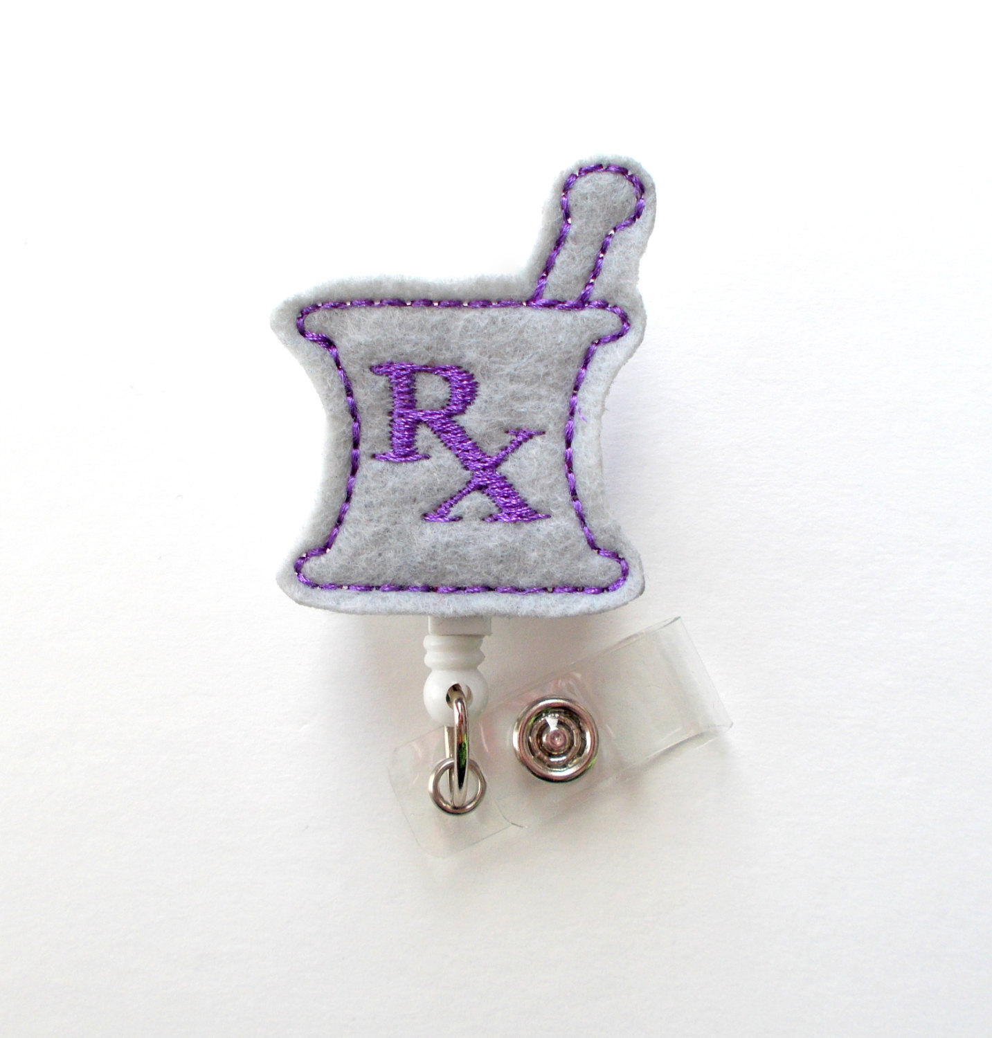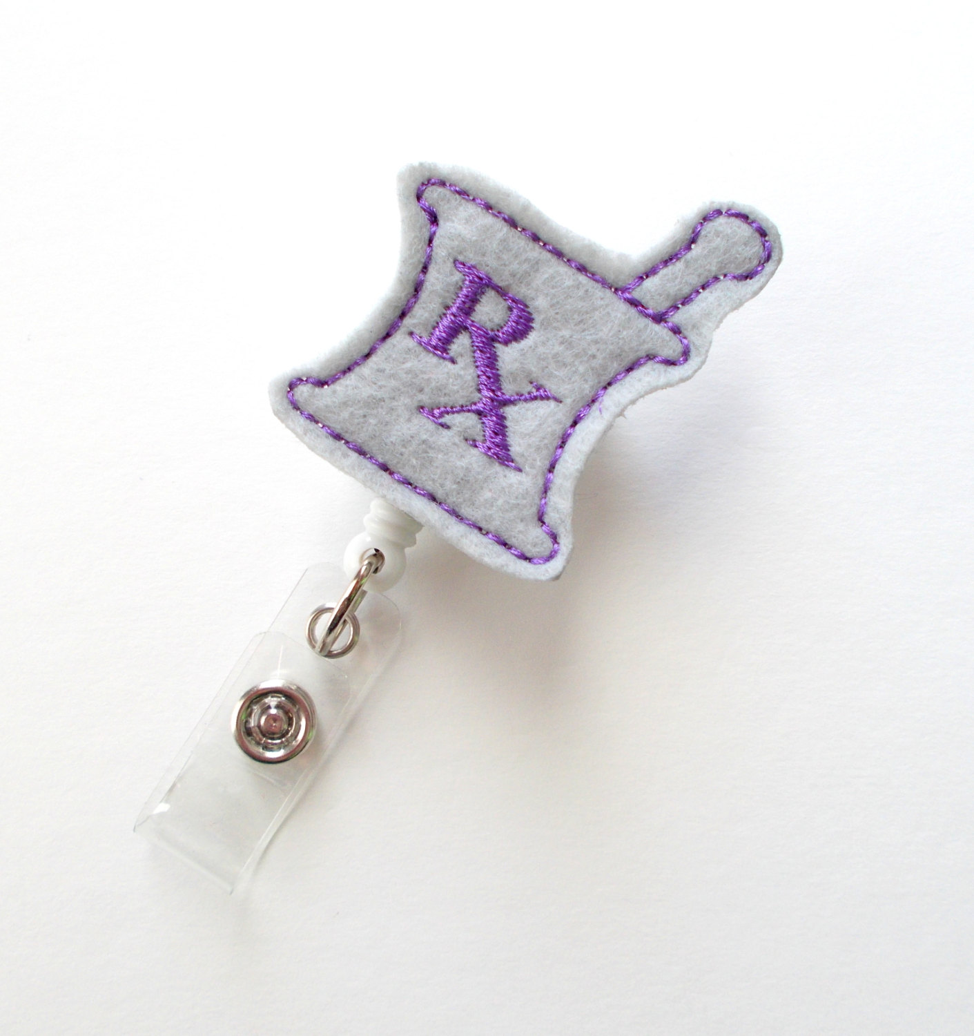 This retractable ID felt badge holder features a gray and purple mortar and pestle felt applique. Sits on a white badge reel. Color may vary slightly.