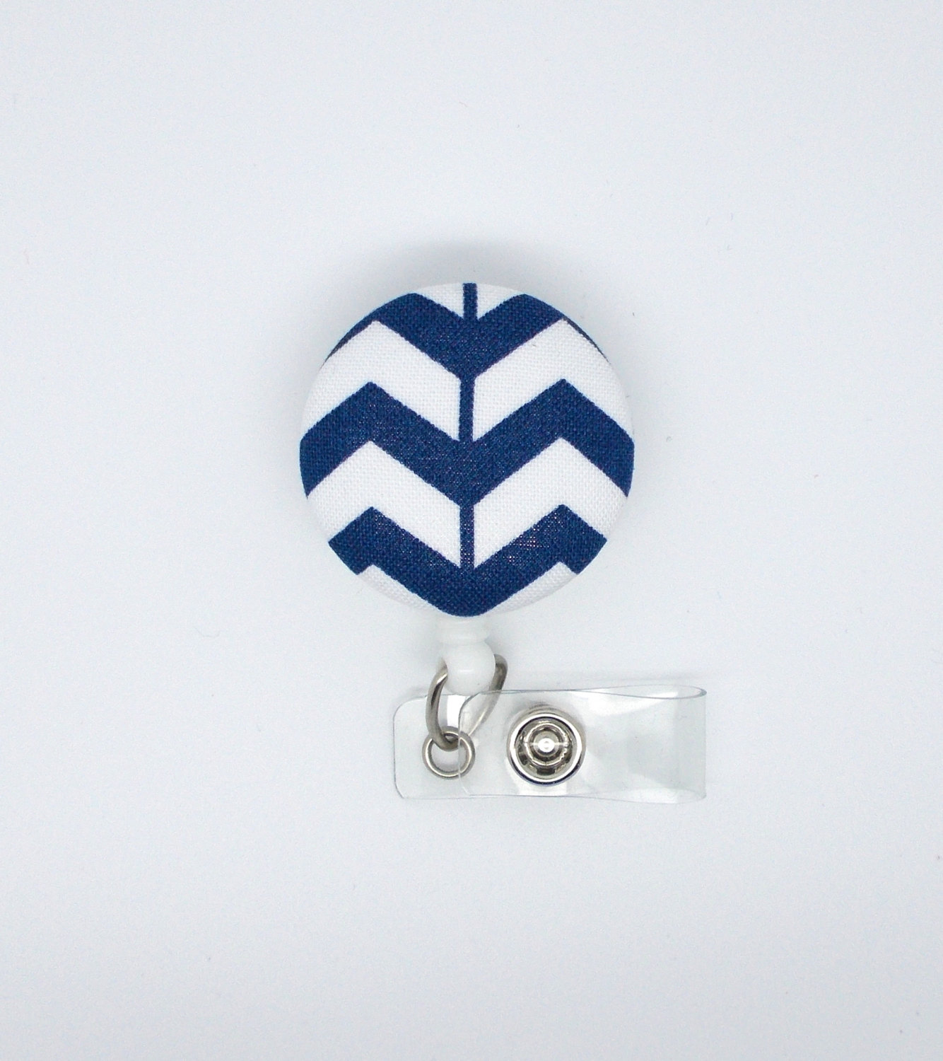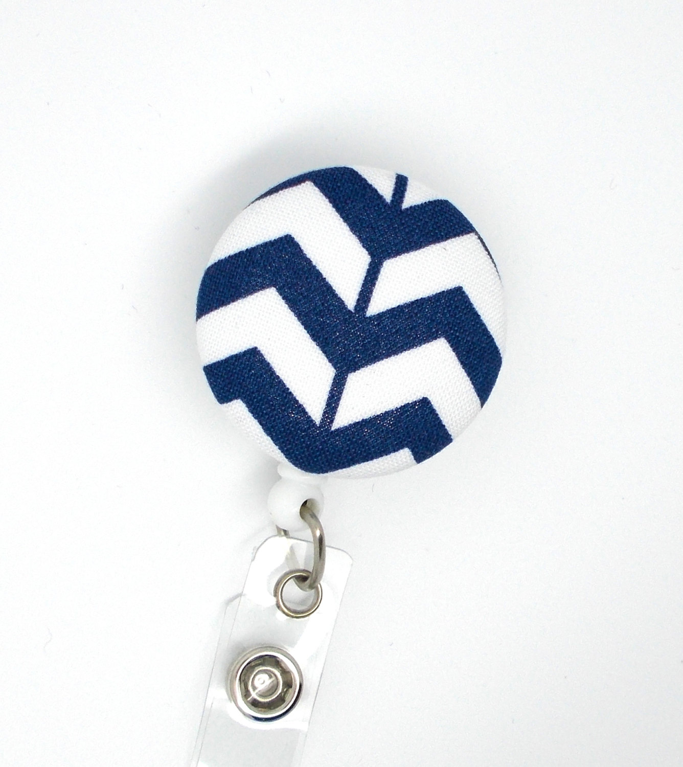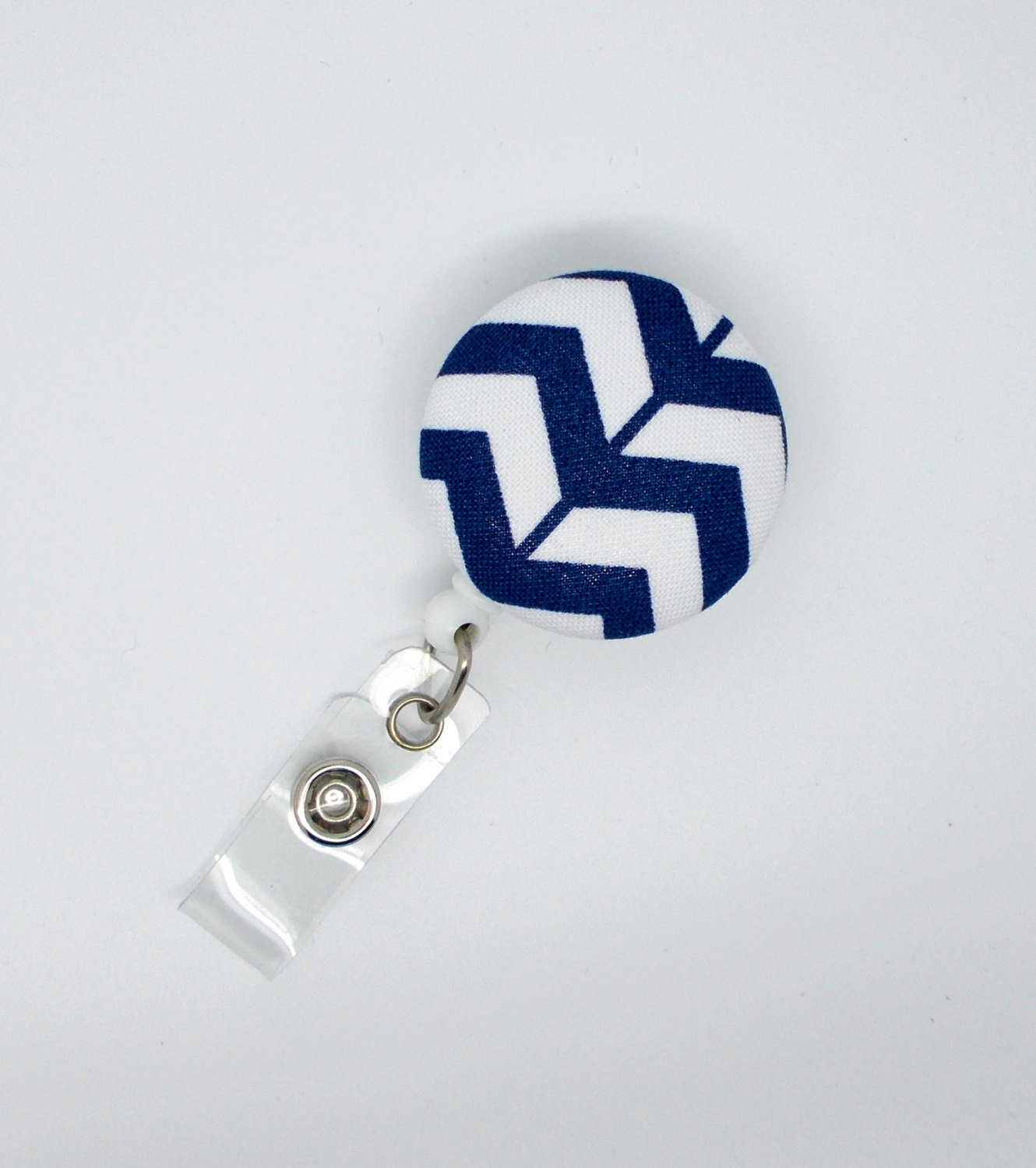 This ID badge reel features a fabric covered button with navy blue chevron braid pattern. Sits on a white, hard plastic badge reel.