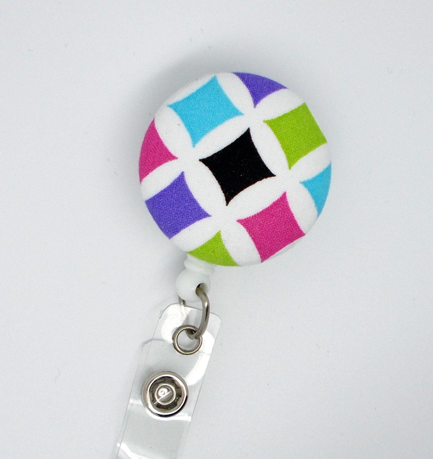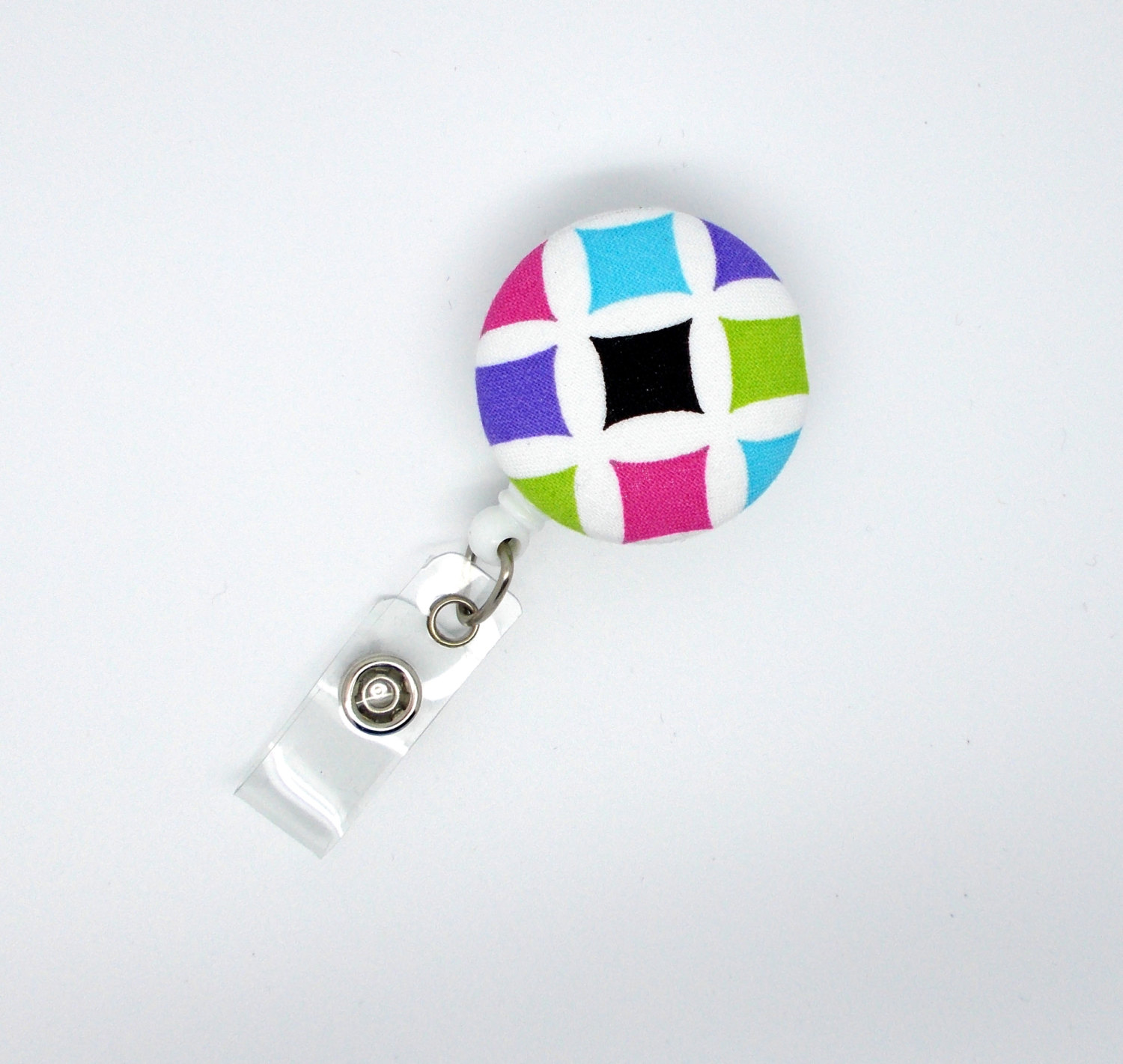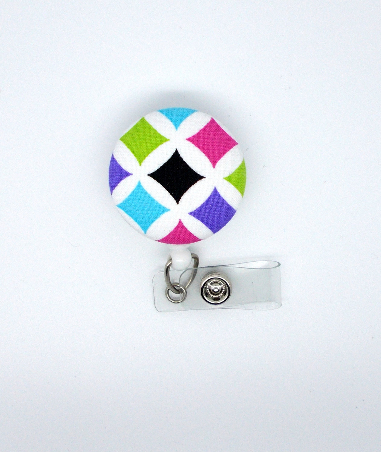 This ID badge reel features a fabric covered button with colorful diamonds throughout the fabric. Pattern placement will vary since it is a busy pattern. Sits on a white, hard plastic badge reel.