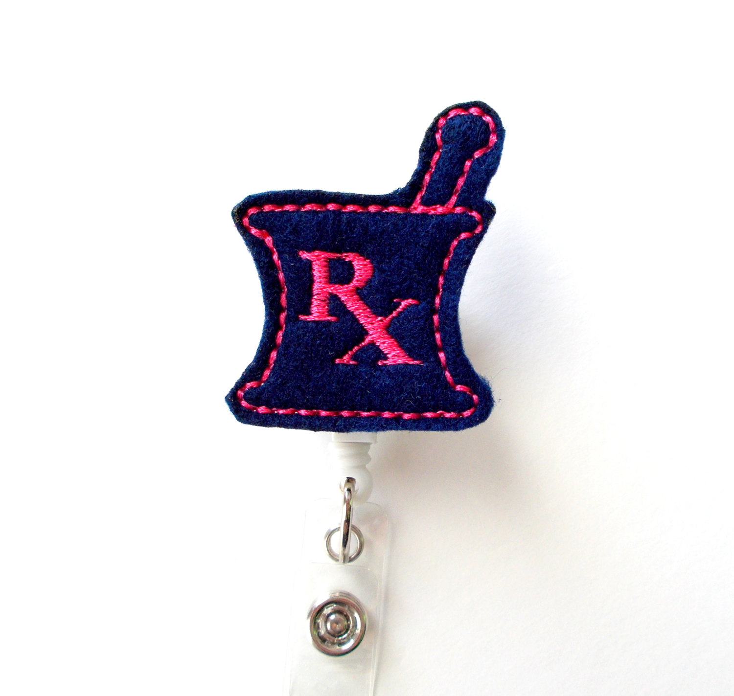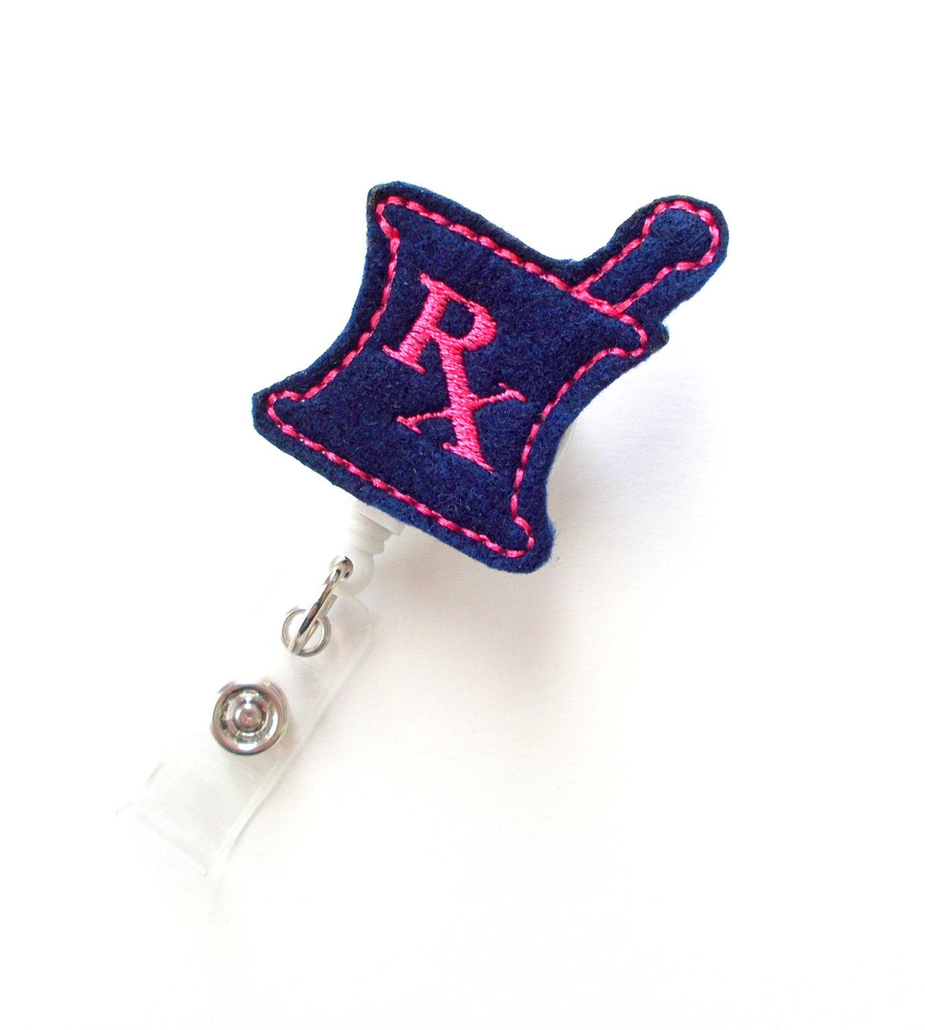 This retractable ID felt badge holder features a pink and navy mortar and pestle felt applique. Sits on a white badge reel.