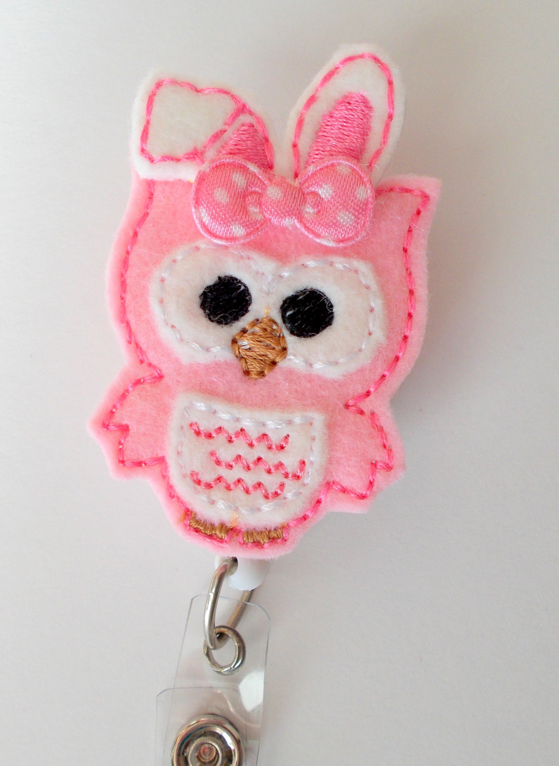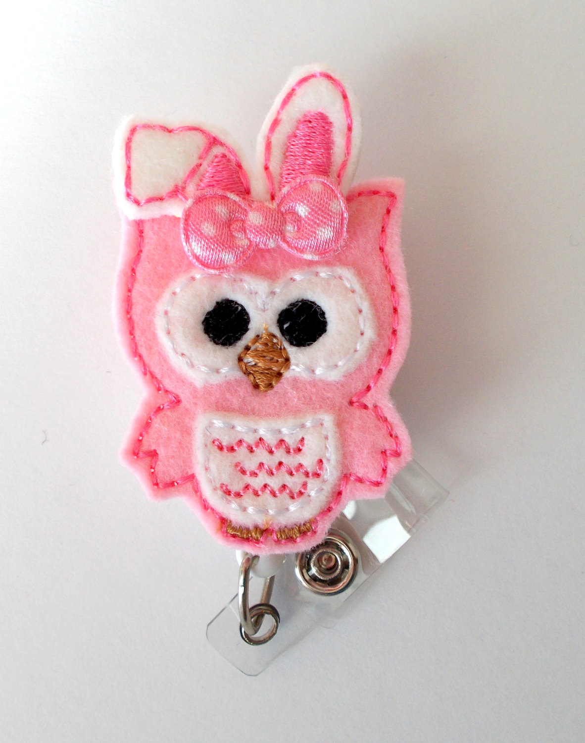 This retractable ID felt badge holder features an owl felt applique with bunny ears. Sits on a white, hard plastic badge reel.