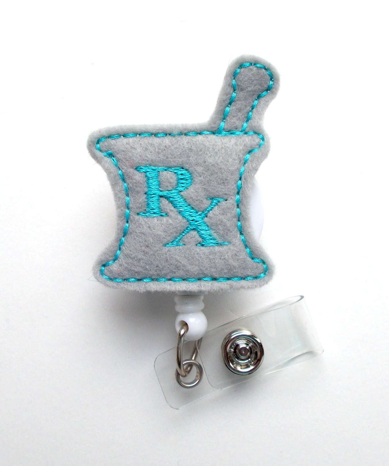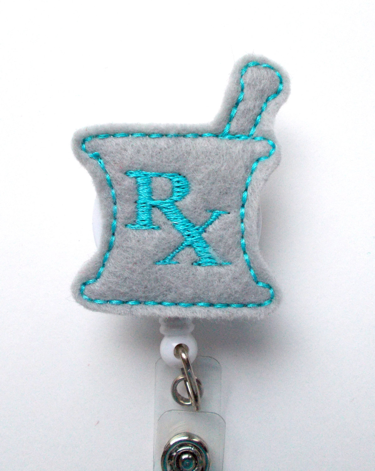 This retractable ID felt badge holder features a gray and blue mortar and pestle felt applique. Sits on a white badge reel. Color may vary slightly.