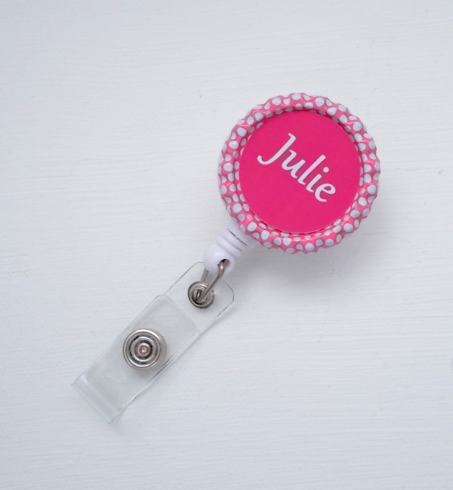 This is a personalized ID badge reel featuring a pink polka dot bottlecap/bottle cap. Please indicate the name in a private message. If you'd like to add initials (e.g. RN, LPN, etc.) just let me know. I can add that at no additional charge. I can customize to your exact specifications.