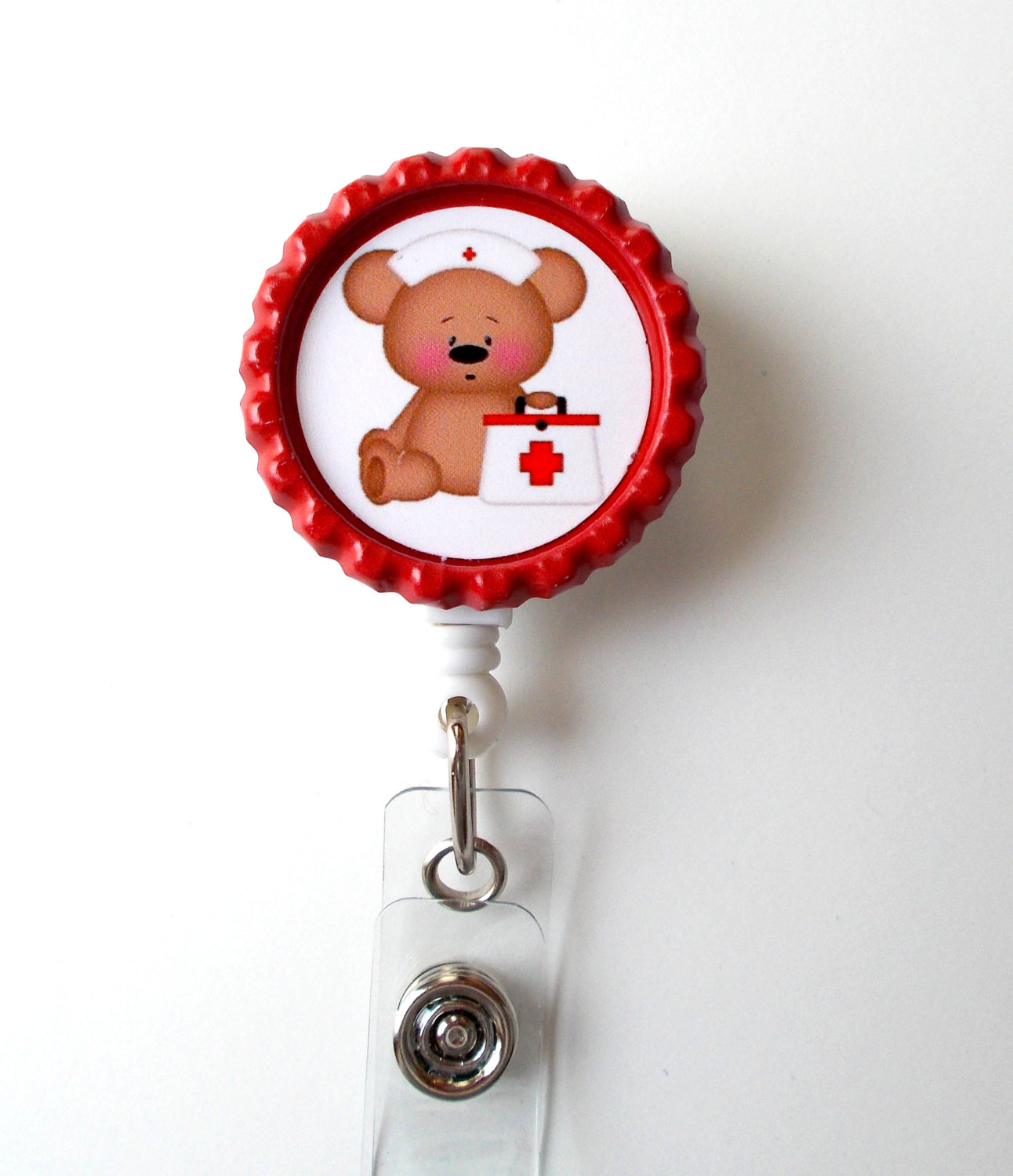 This ID Badge holder features a nurse bear. Sits on a red bottle cap.