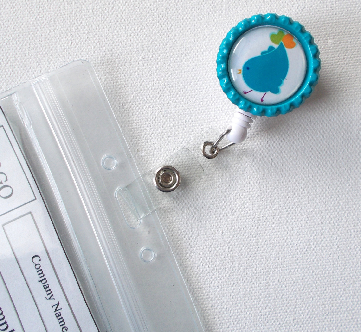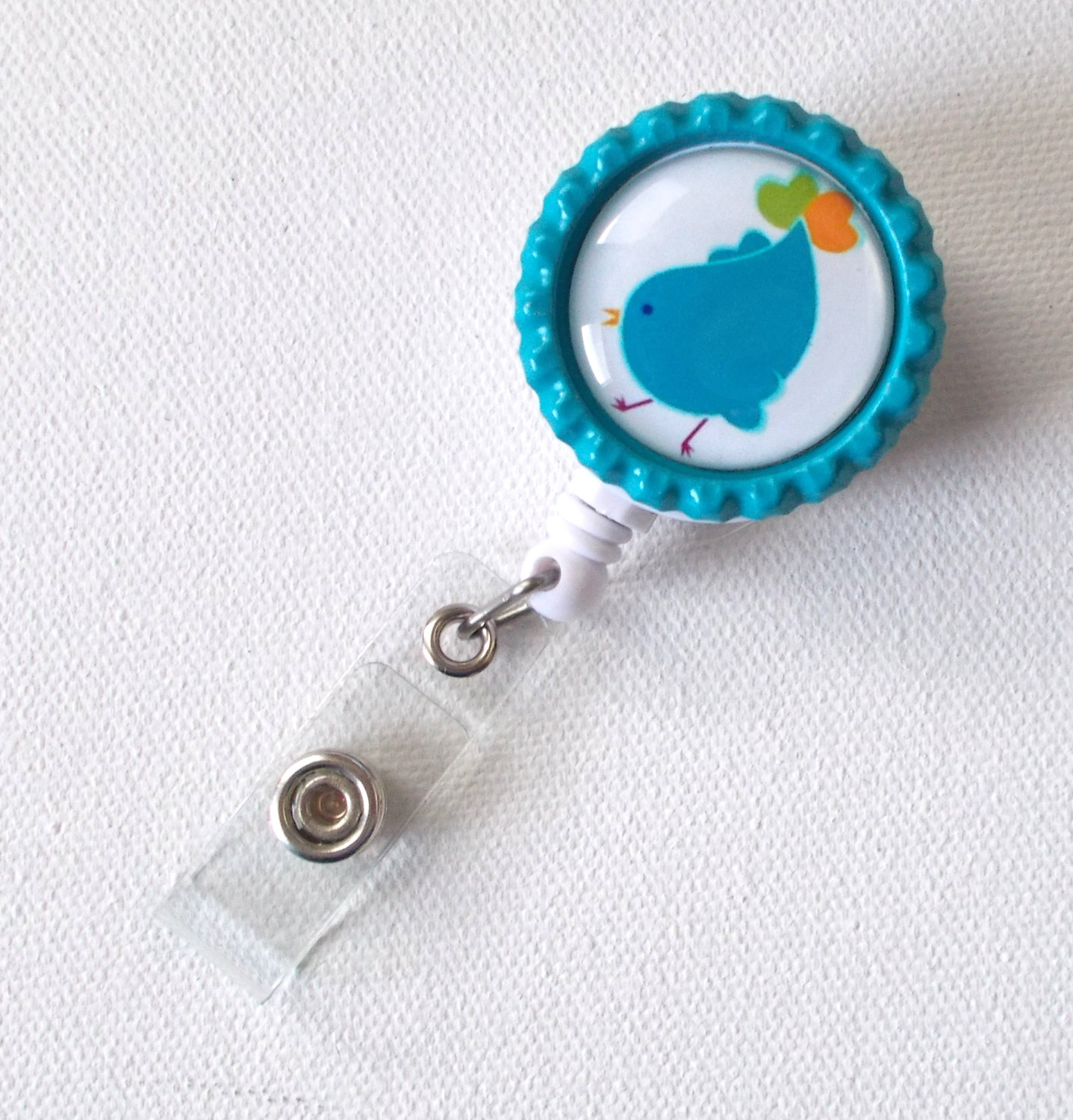 This blue chick badge reel is perfect for nurses, teachers or any other profession that has to wear an ID badge reel. Graphic sits on a blue bottle cap. Graphic is sealed with an epoxy sealant. Graphic is glued to a white, hard plastic badge reel.
