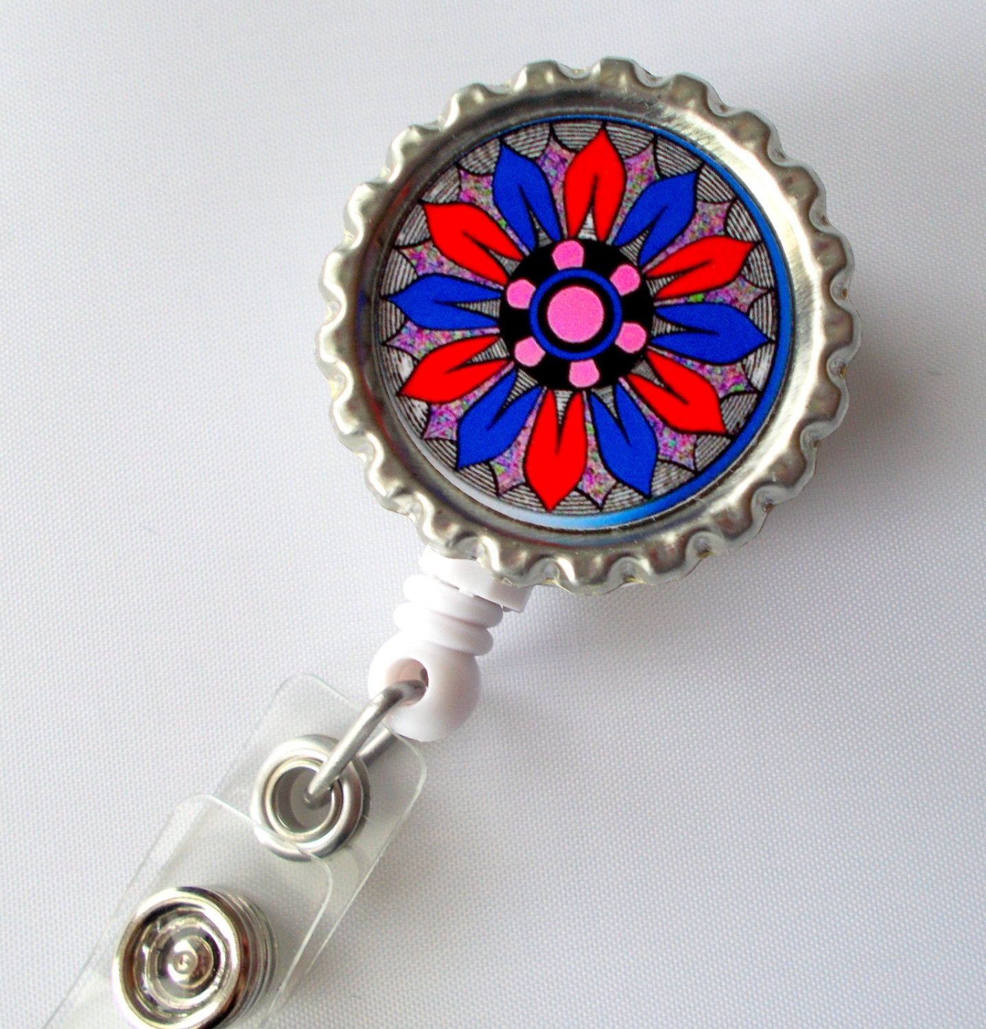 This bottle cap badge reel features a funky flower in red, white and blue. Graphic sits on a silver bottle cap and is sealed with an epoxy sealant (it is not waterproof but can be wiped clean with a damp cloth). Bottle cap is glued to a white, hard plastic badge reel.