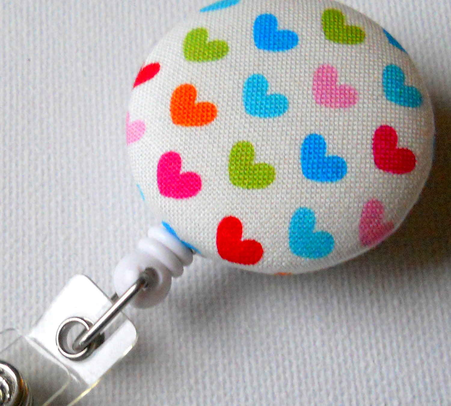 This fabric covered button ID badge reel features hearts sprinkled throughout the fabric in various colors. Super cute!