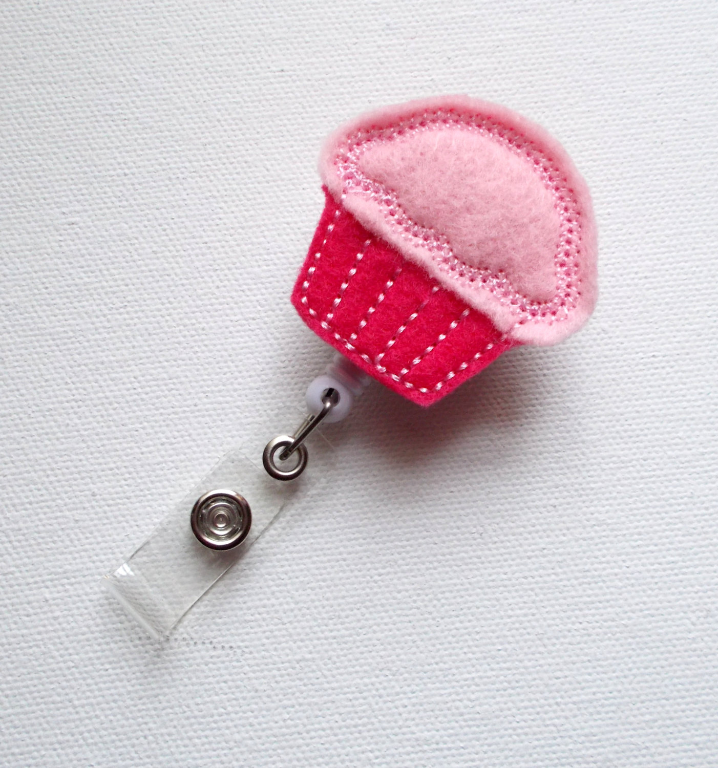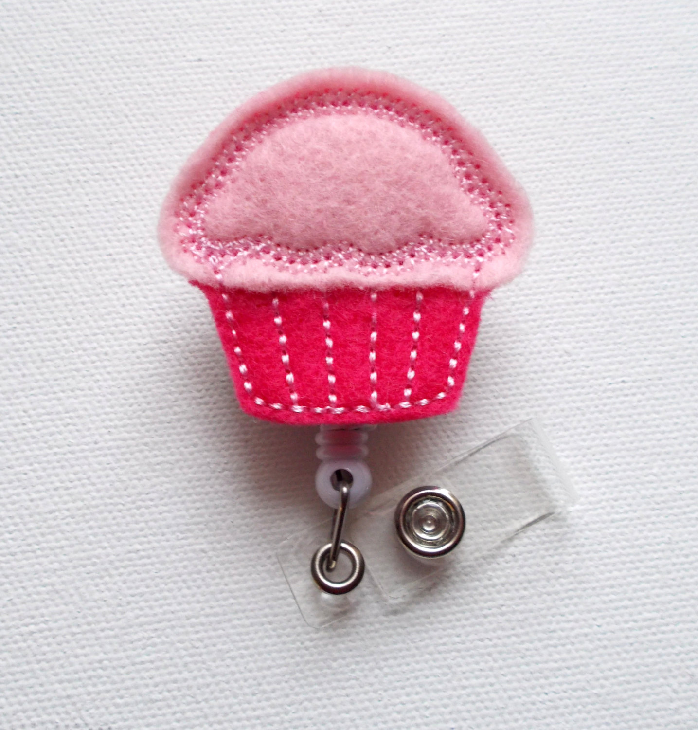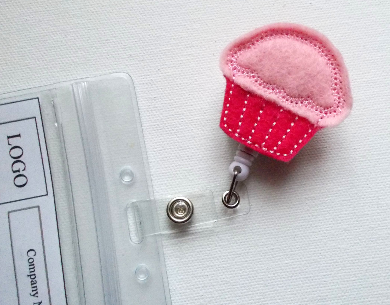 This retractable ID felt badge holder features a pink cupcake felt applique.