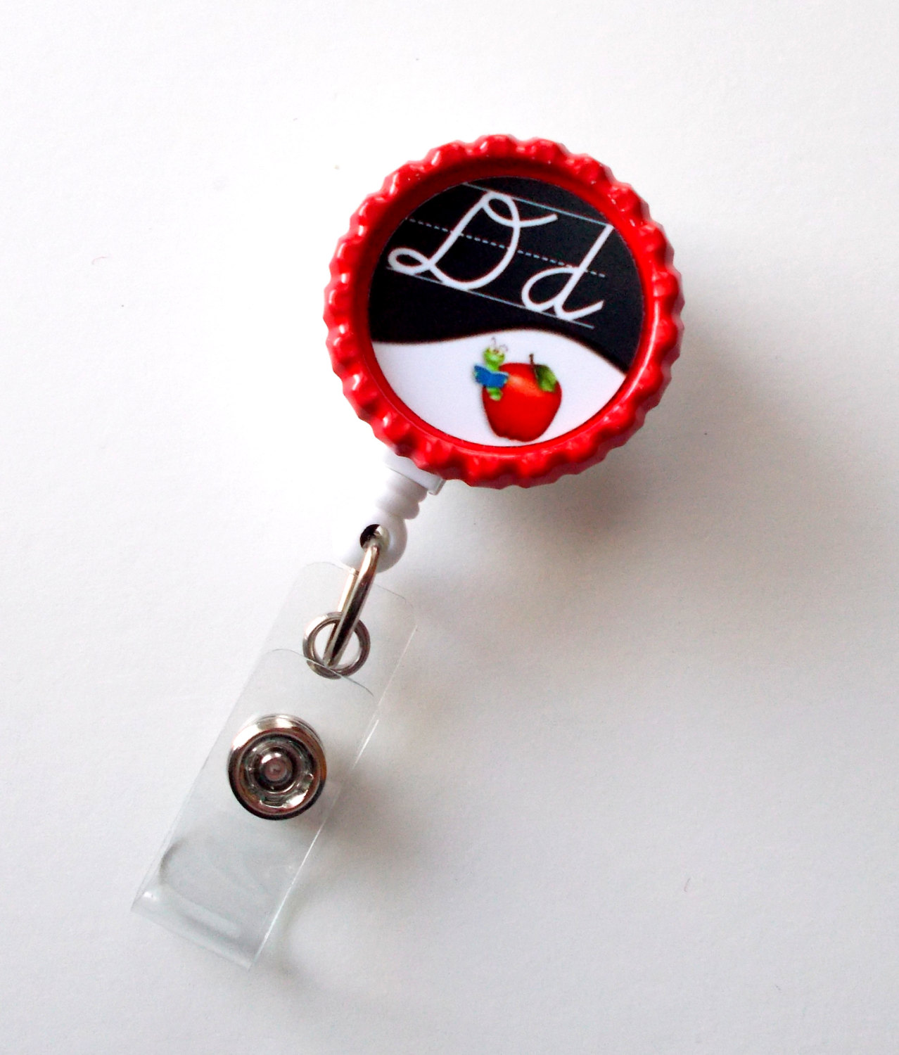 This retractable ID features a chalkboard initial and features a red apple. Sits on a red bottle cap. White retractable ID badge reel. Sealed with an epoxy sealant. May be wiped clean with damp cloth but it is not waterproof.