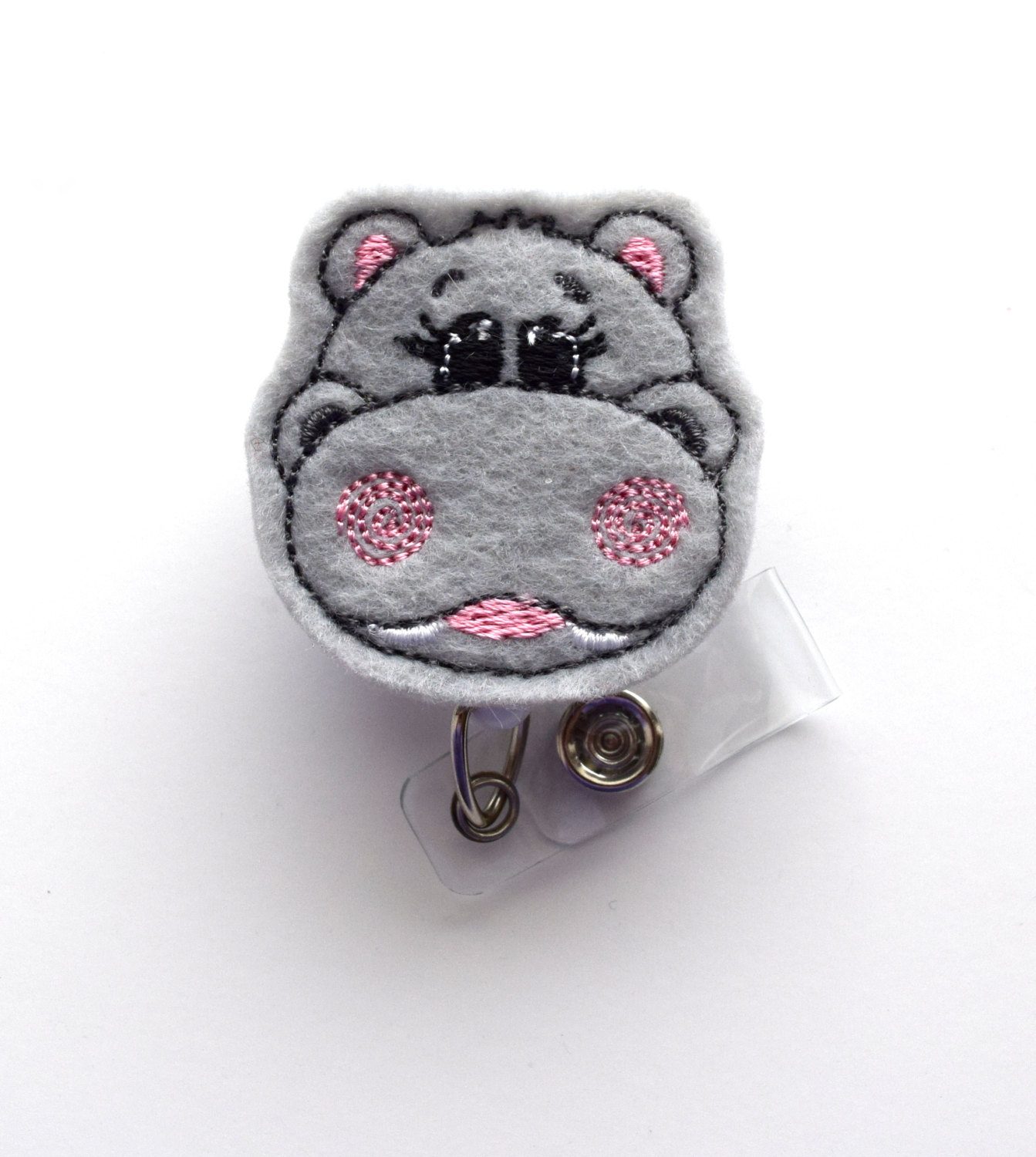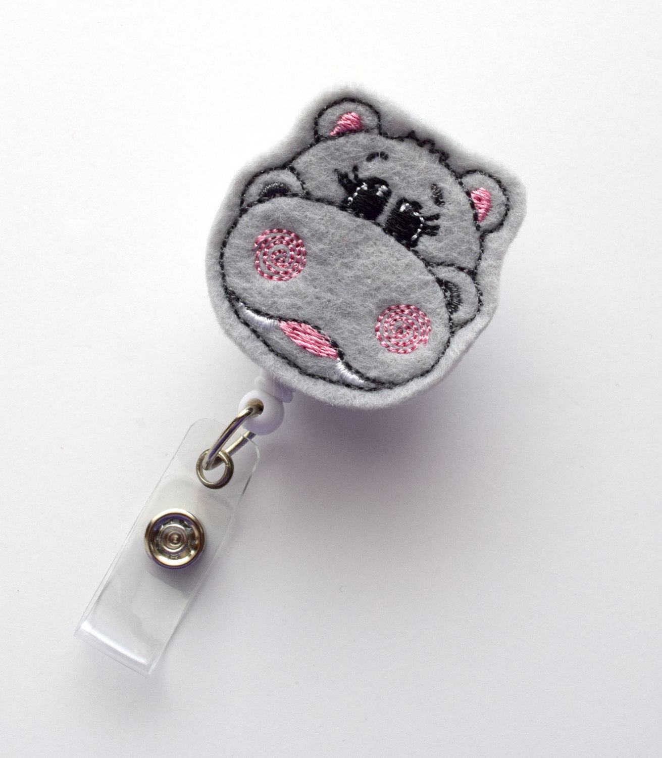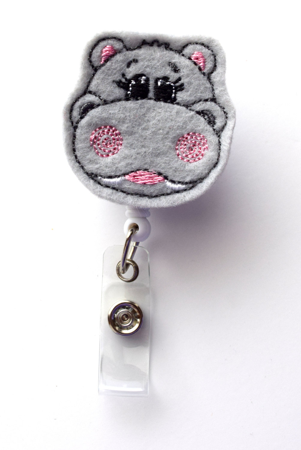 This retractable ID felt badge holder features a gray hippo felt applique with pink accents. Sits on a white, hard plastic badge reel.