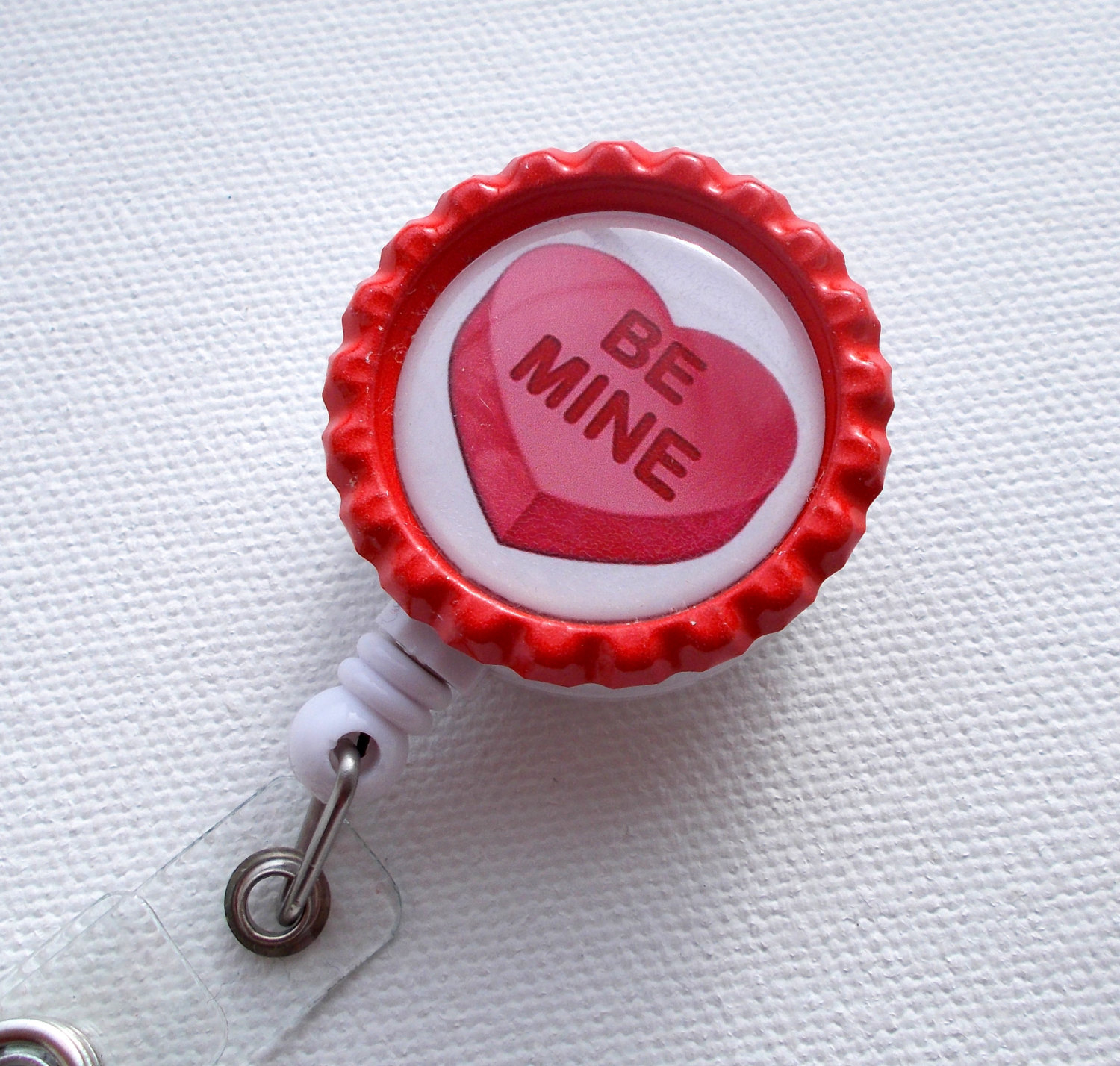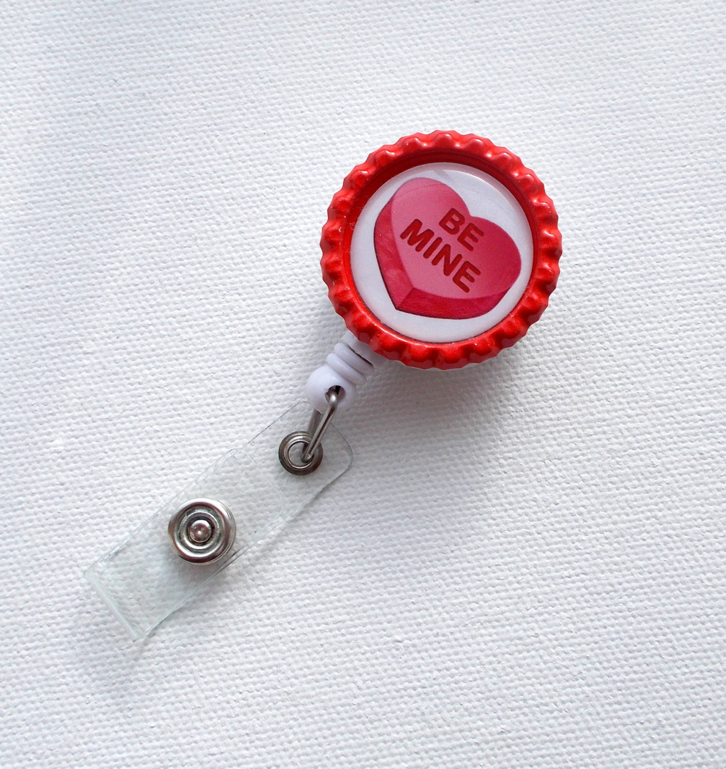 This is an ID badge reel featuring the words "Be Mine " on a pink heart . It sets on a red bottlecap/bottle cap. Perfect accessory for Valentine's Day!