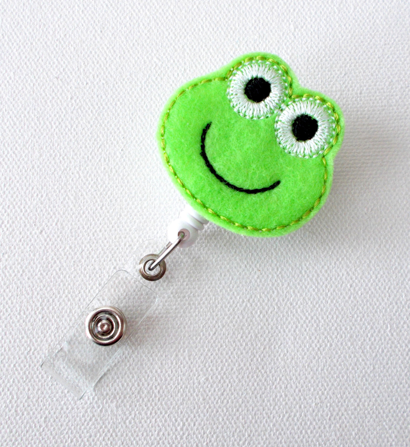 This retractable ID felt badge holder features a cute green frog felt applique. Perfect for medical staff who work with children or a preschool/elementary teacher.