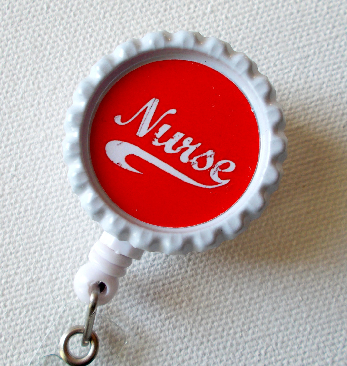 The word NURSE accents this badge reel. Graphic sets on a white bottle cap. Graphic is sealed with an epoxy sealant. You may wipe the graphic with a damp cloth to clean it but it is not waterproof.