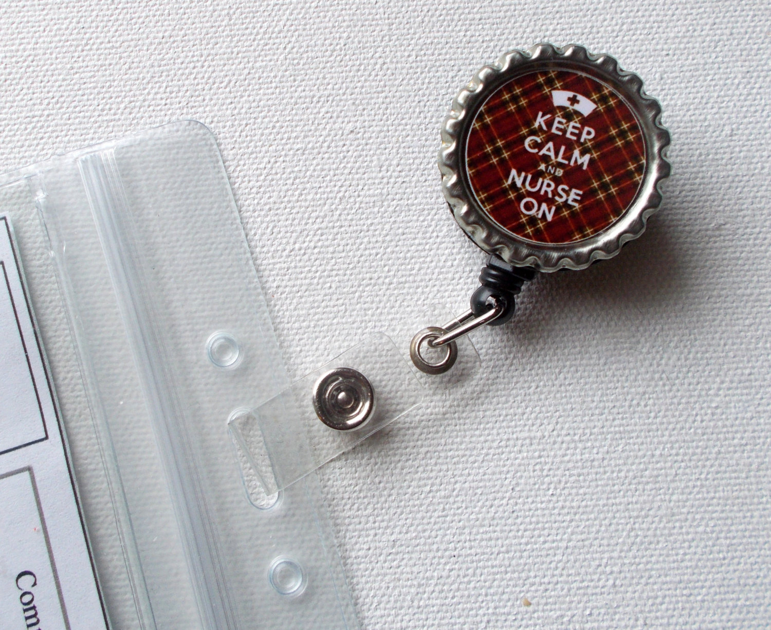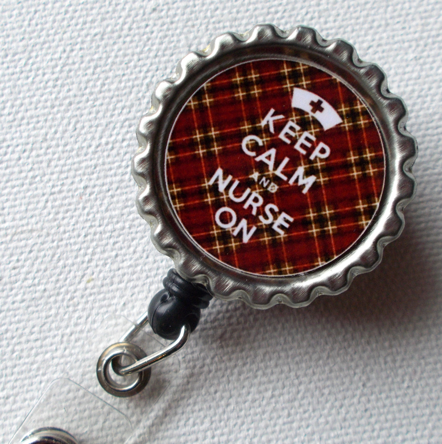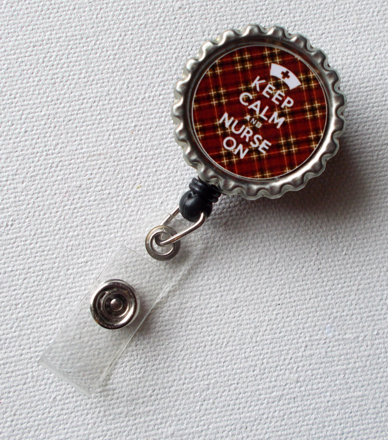 Keep Calm and Nurse On is the perfect badge holder for any nurse. Background is brown with hints of gold plaid/tartan. Graphic sits on a silver bottle cap. Graphic is sealed with an epoxy sealant. You may wipe the graphic with a damp cloth to clean it but it is not waterproof.