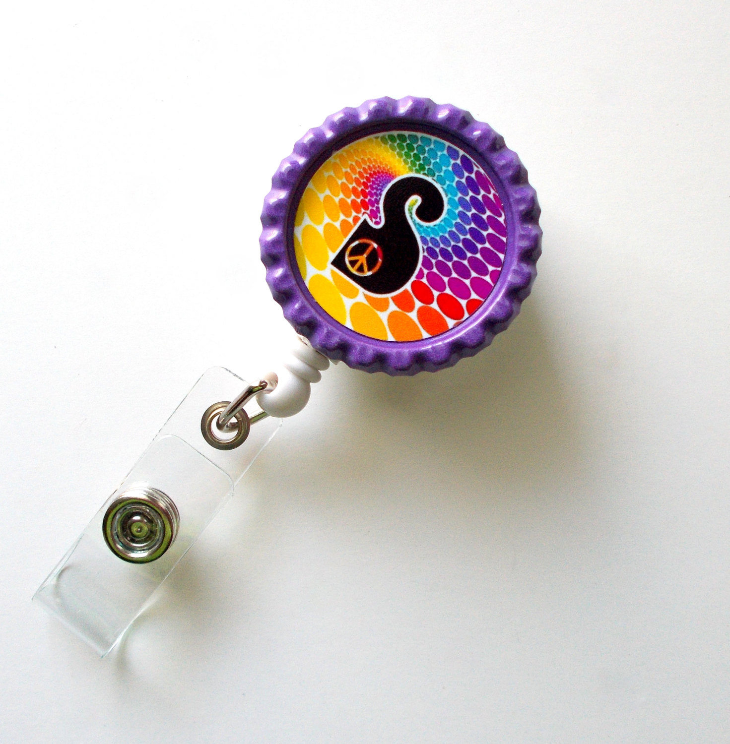 Groovy personalized rainbow ID Badge holder set on a purple bottle cap. Super cute and lots of color! Just indicate the initial you want when placing order.