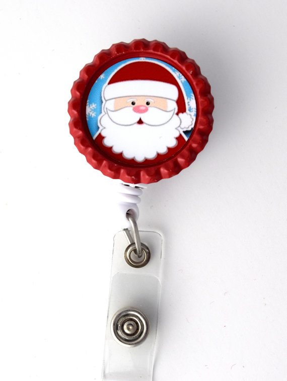 This ID Badge holder features a cute Santa Claus face with a blue and white snowflake background. Graphic is sealed with an epoxy sealant and sits on a red bottle cap. Badge reel is white.
