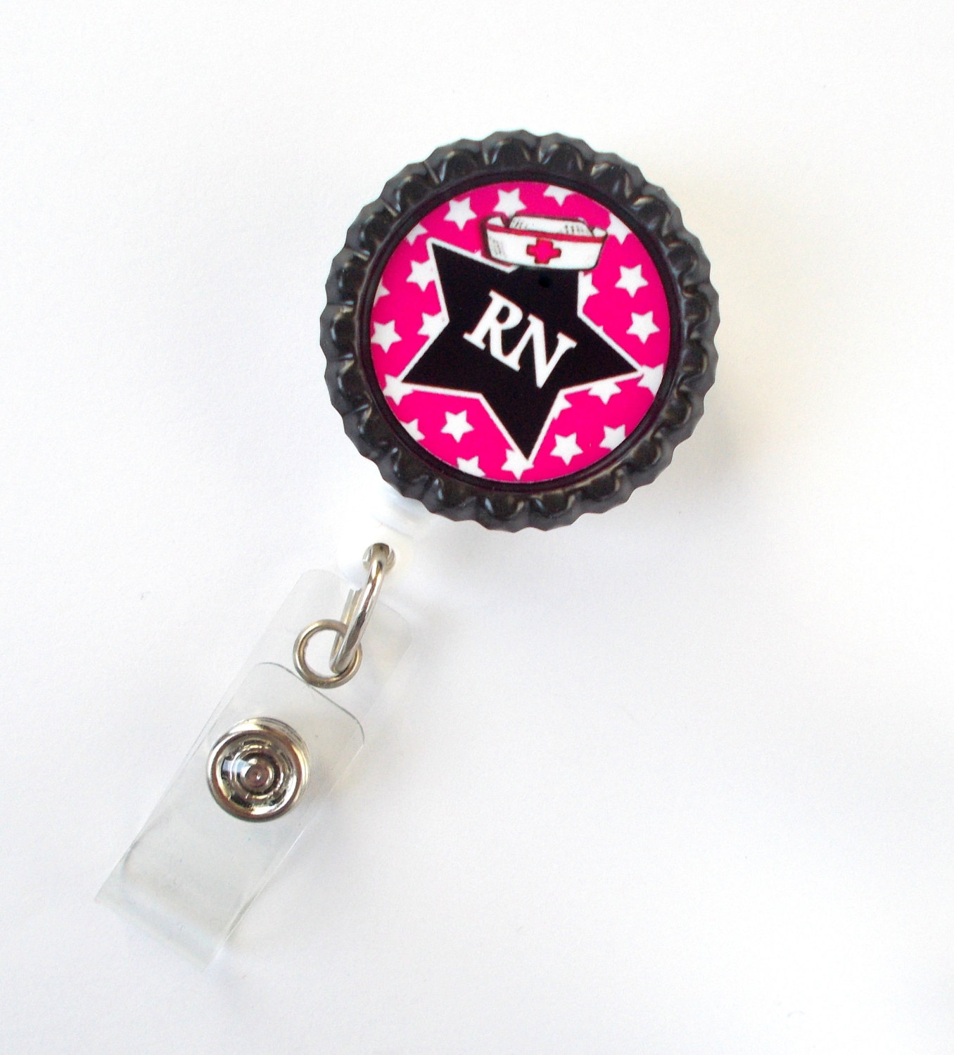 This badge features the initial RN inside a black star. Image is sealed with an epoxy sealant and sits on a black bottle cap. Bottle cap is glued to a white, hard plastic badge reel.