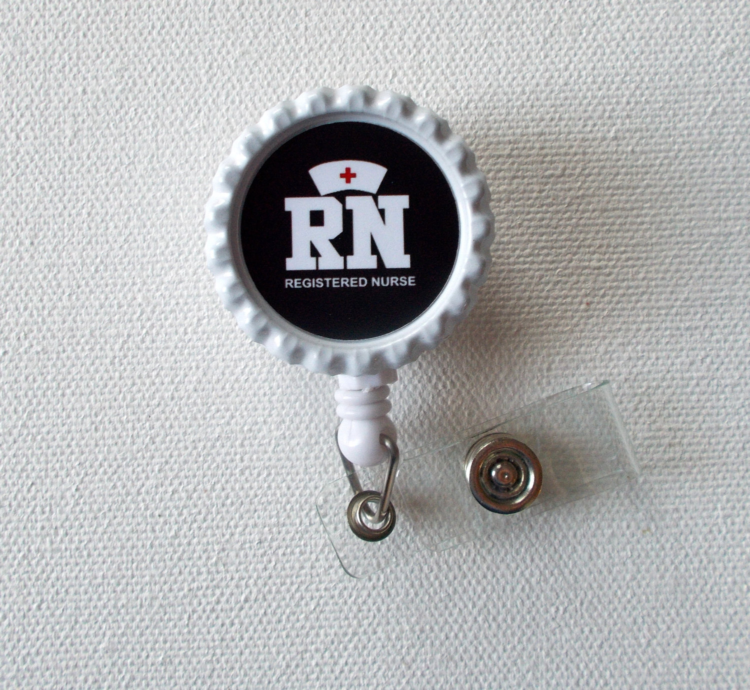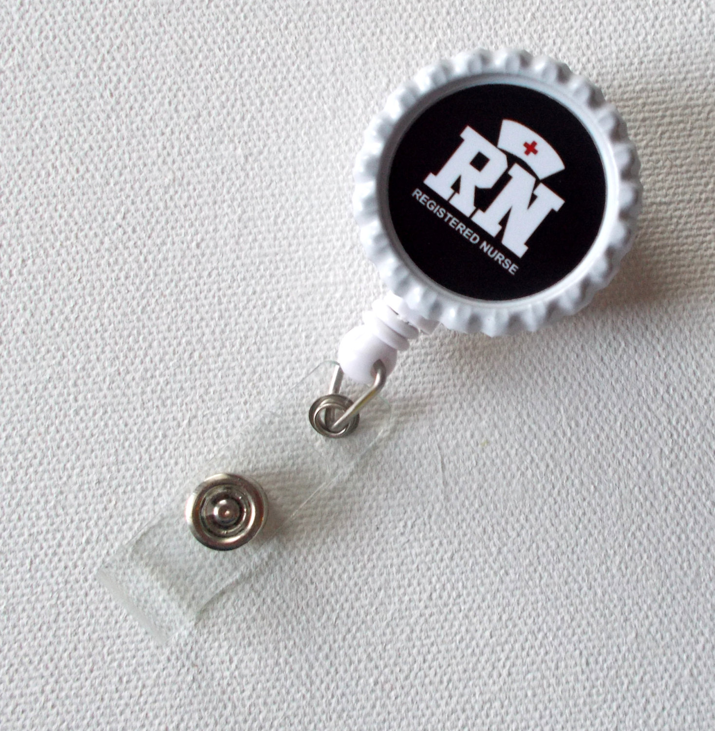 RN - Registered Nurse name badge holder. Graphic sets on a white bottle cap and sealed with an epoxy sealant. You may wipe the graphic with a damp cloth to clean it but it is not waterproof.