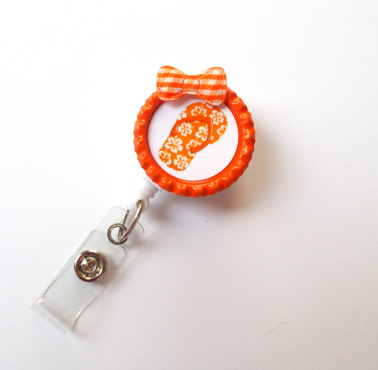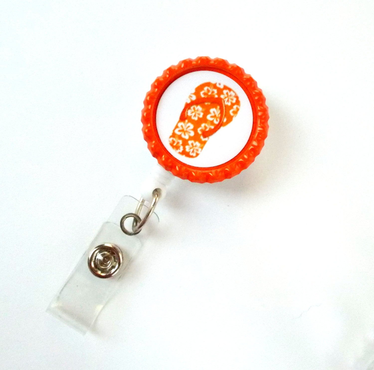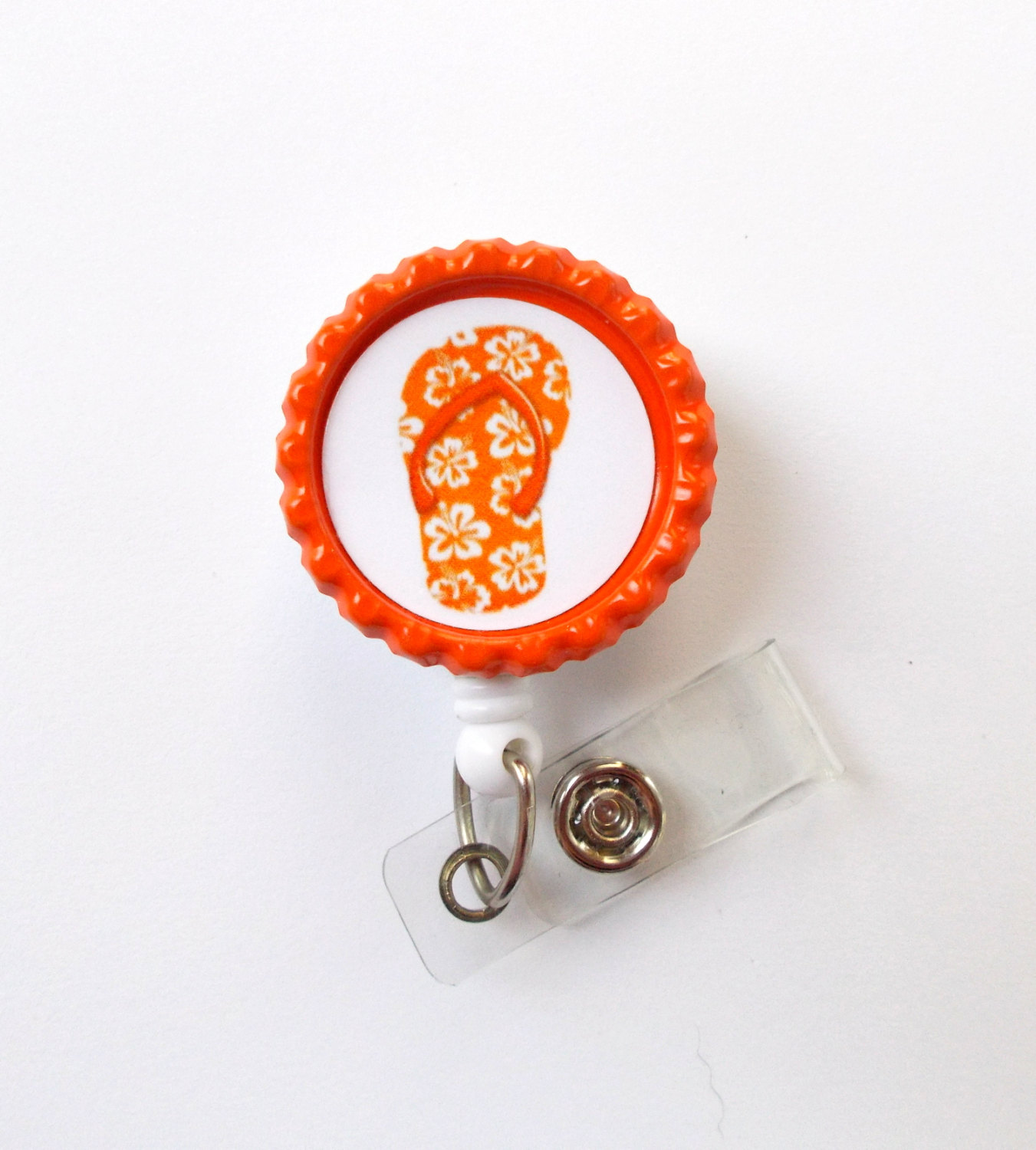 This badge features an orange and white flip flop graphic. Graphic is sealed with an epoxy sealant. Graphic is glued to an orange bottle cap. Sits on a white, hard plastic badge reel.