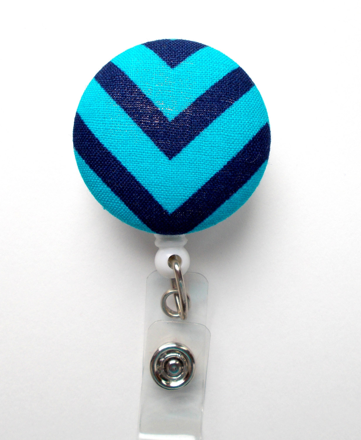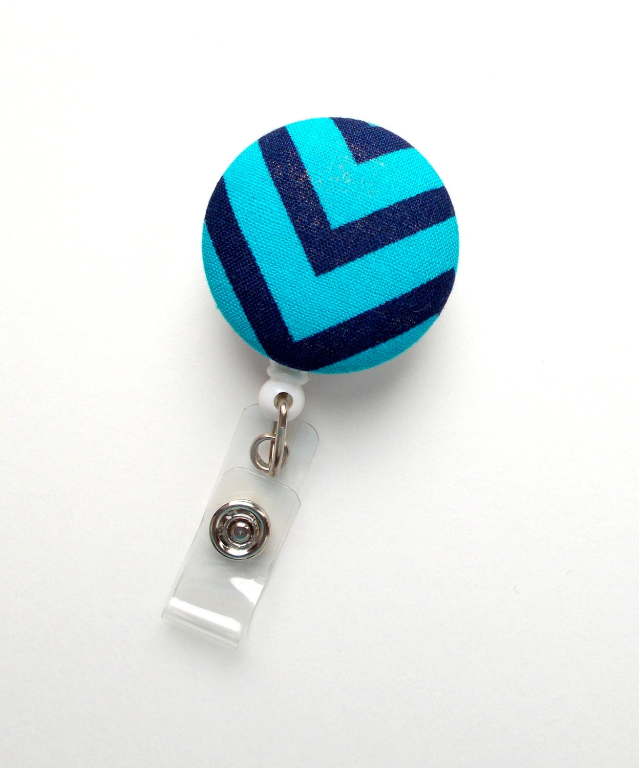 This ID badge reel features a navy and turquoise chevron striped fabric covered button. Button sits on a white, hard plastic badge reel.