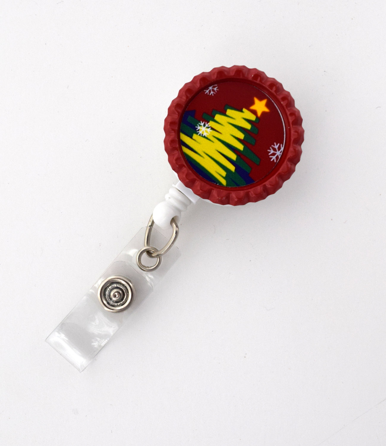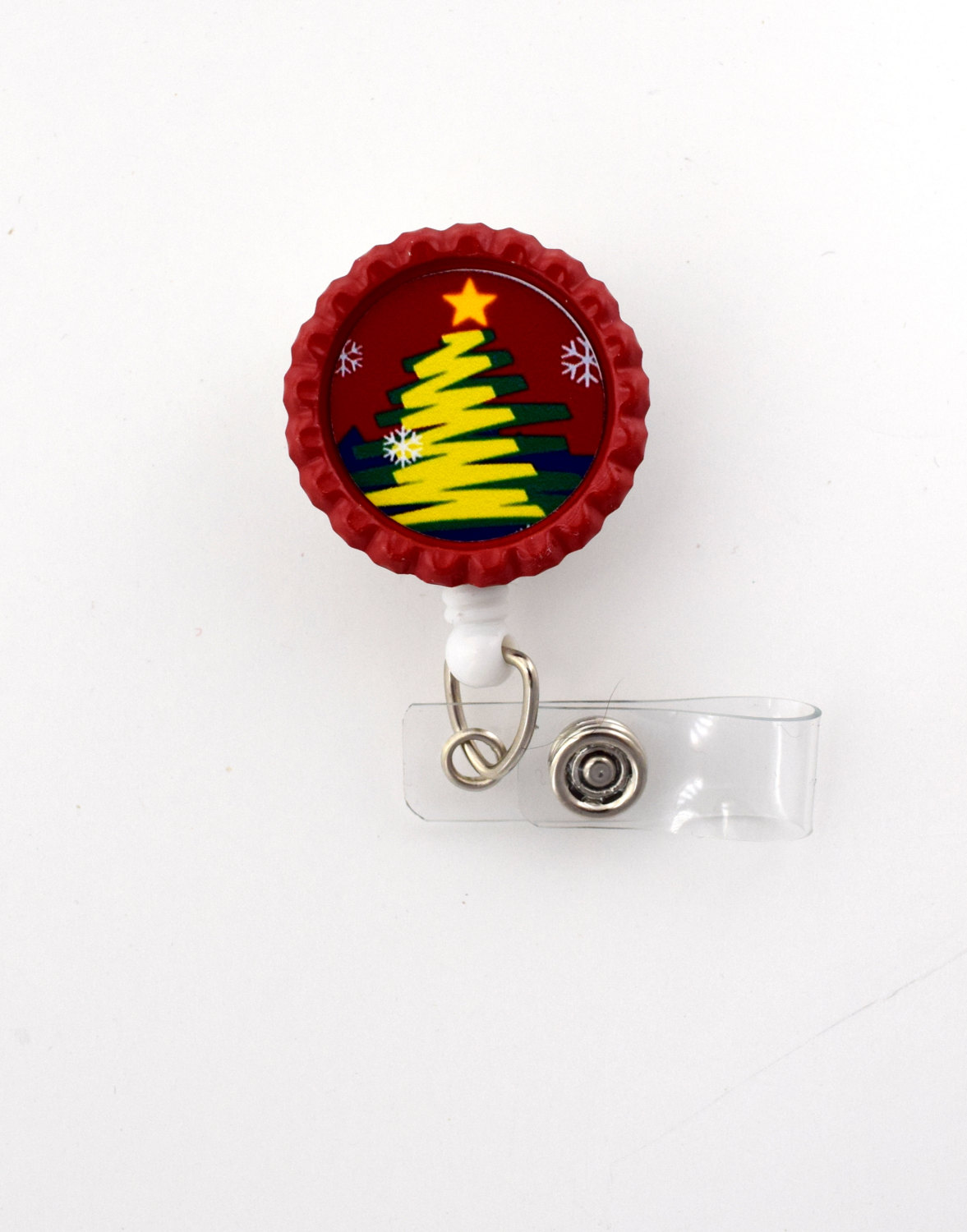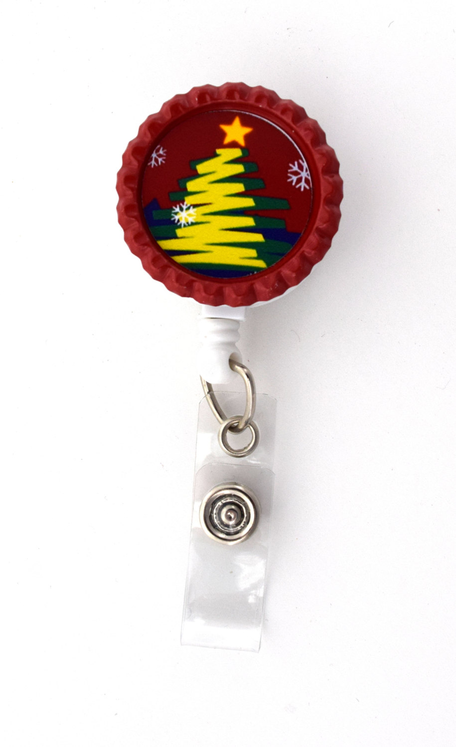 This ID Badge holder features a green and gold Christmas tree. Graphic is sealed with an epoxy sealant and sits on a red bottle cap. Badge reel is white.