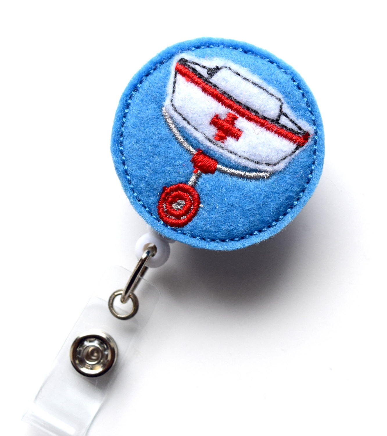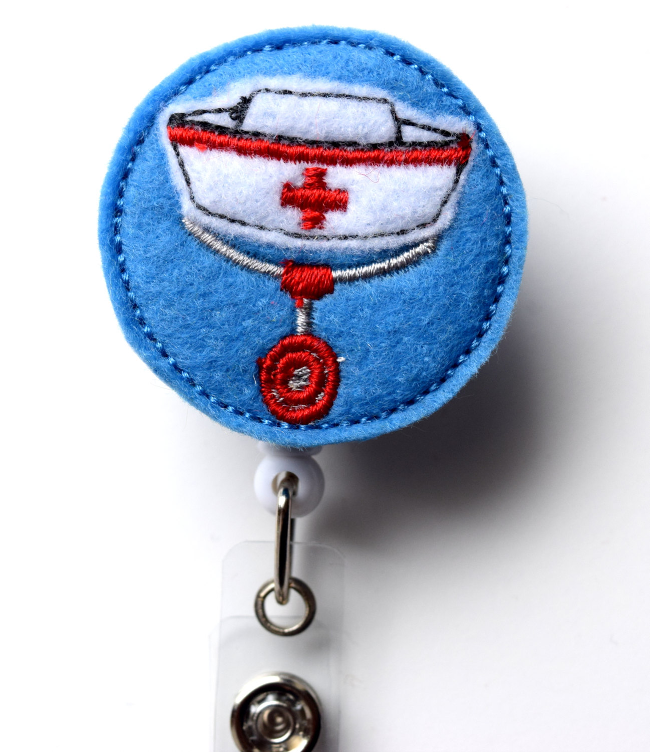 This retractable ID felt badge holder features a blue felt applique with a nurse's cap and stethoscope. Sits on a white badge reel.