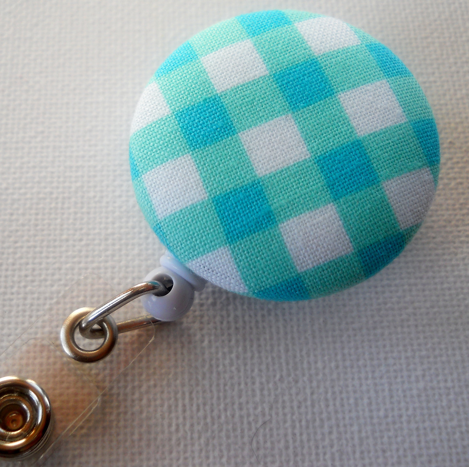 This Retractable ID badge reel features an aqua blue and white plaid fabric.
