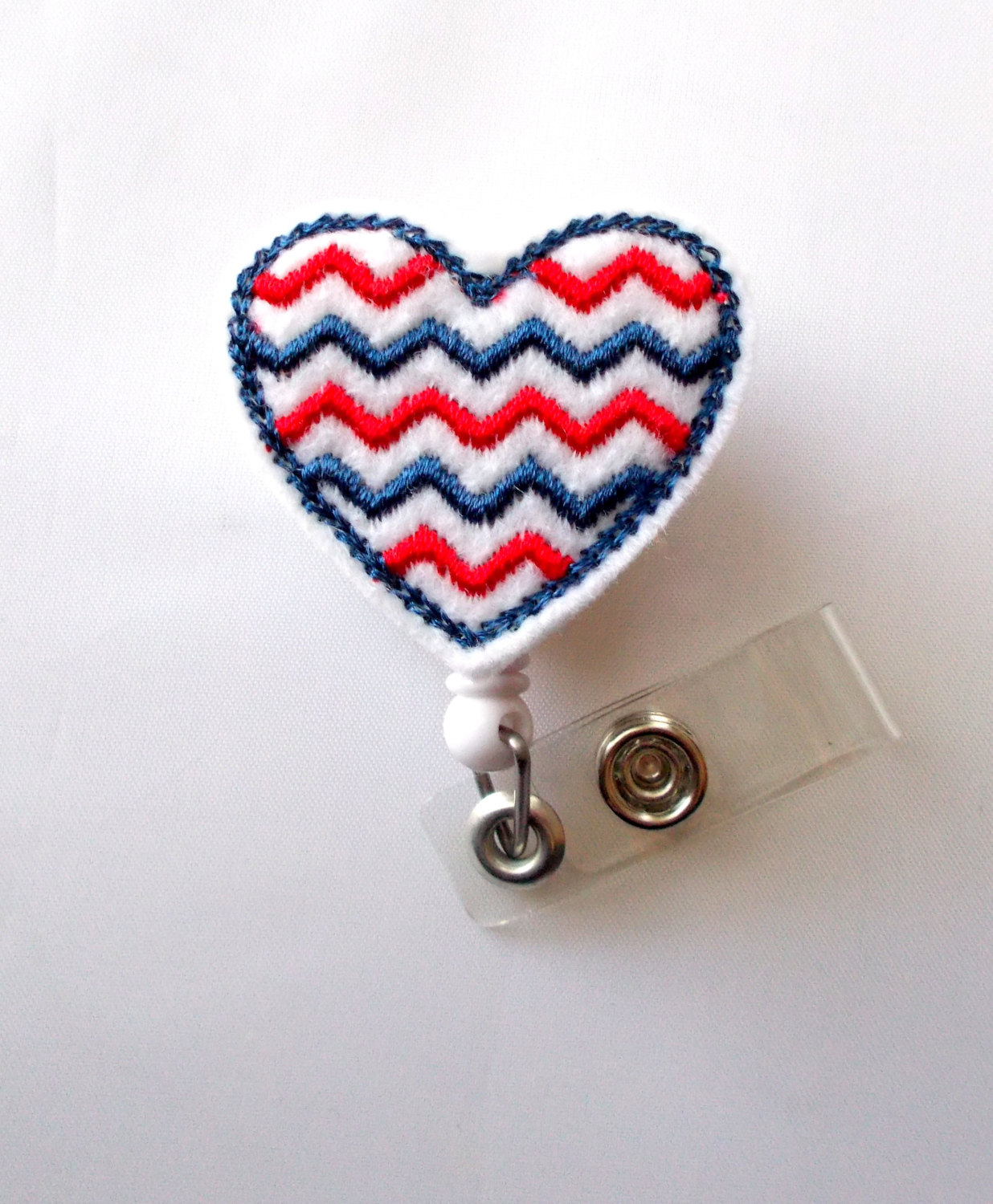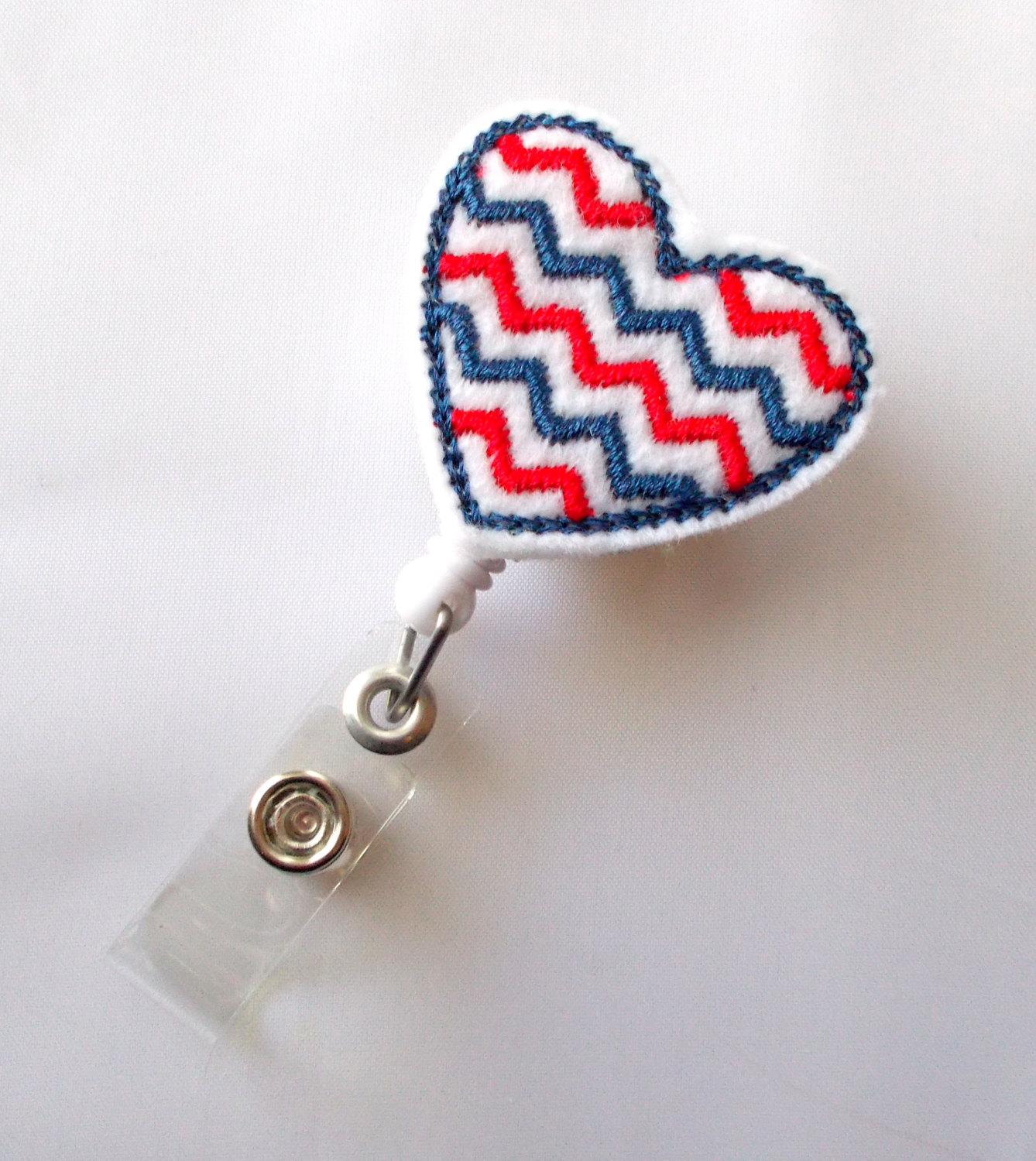 This retractable ID felt badge holder features a red, white and blue Chevron heart felt applique.