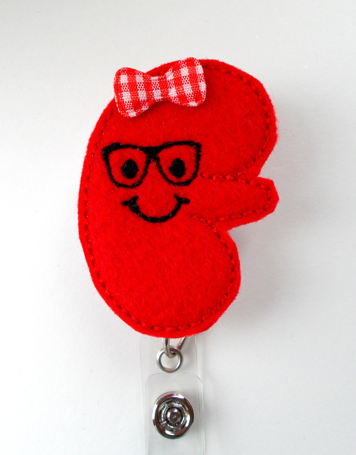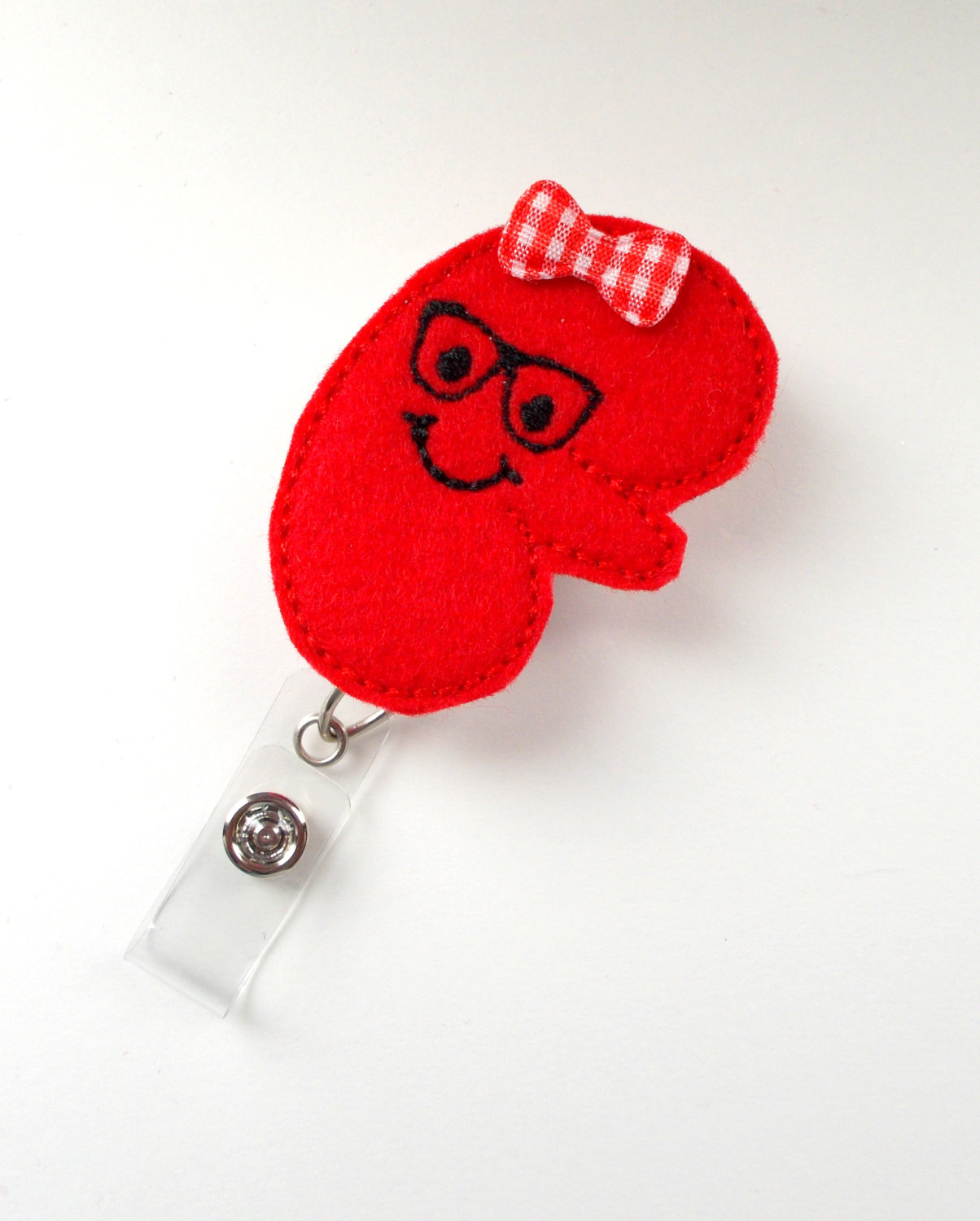 This retractable ID felt badge holder features a red kidney with glasses felt applique, accented with a red and white gingham checked bow. Sits on a white, hard plastic badge reel.