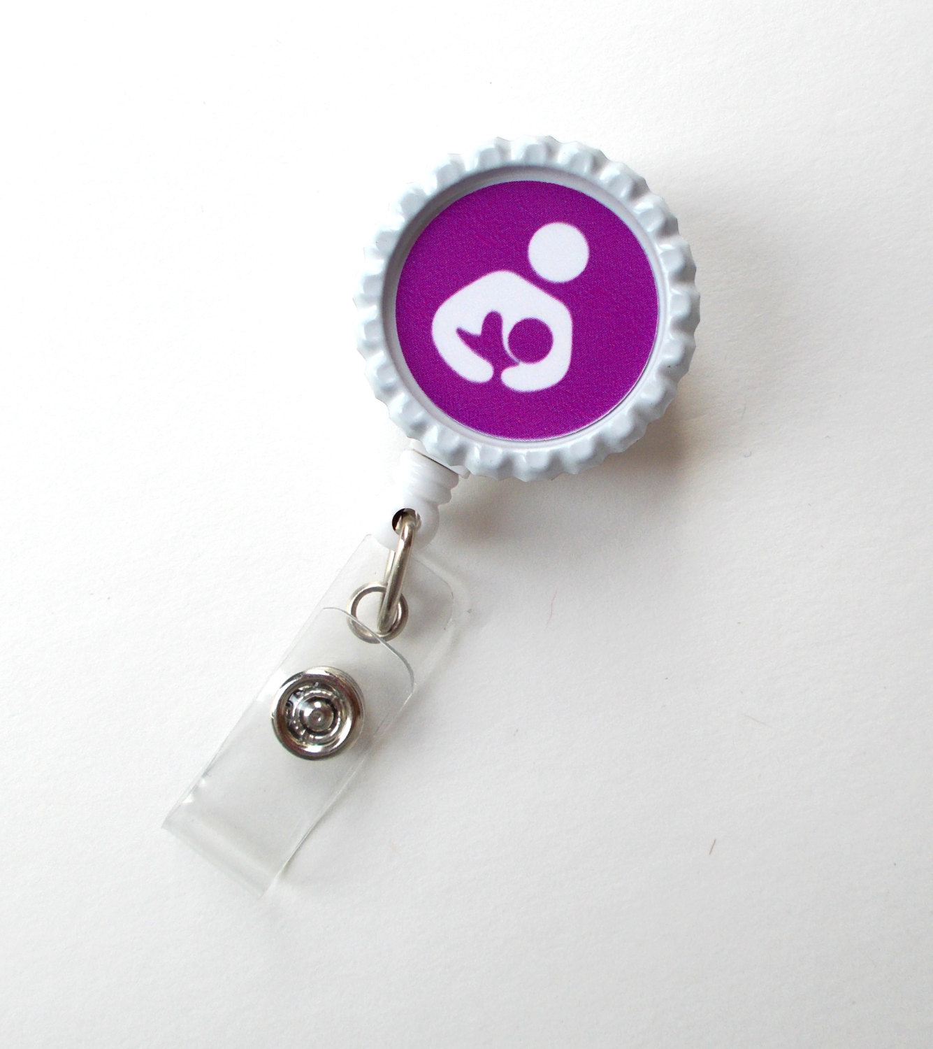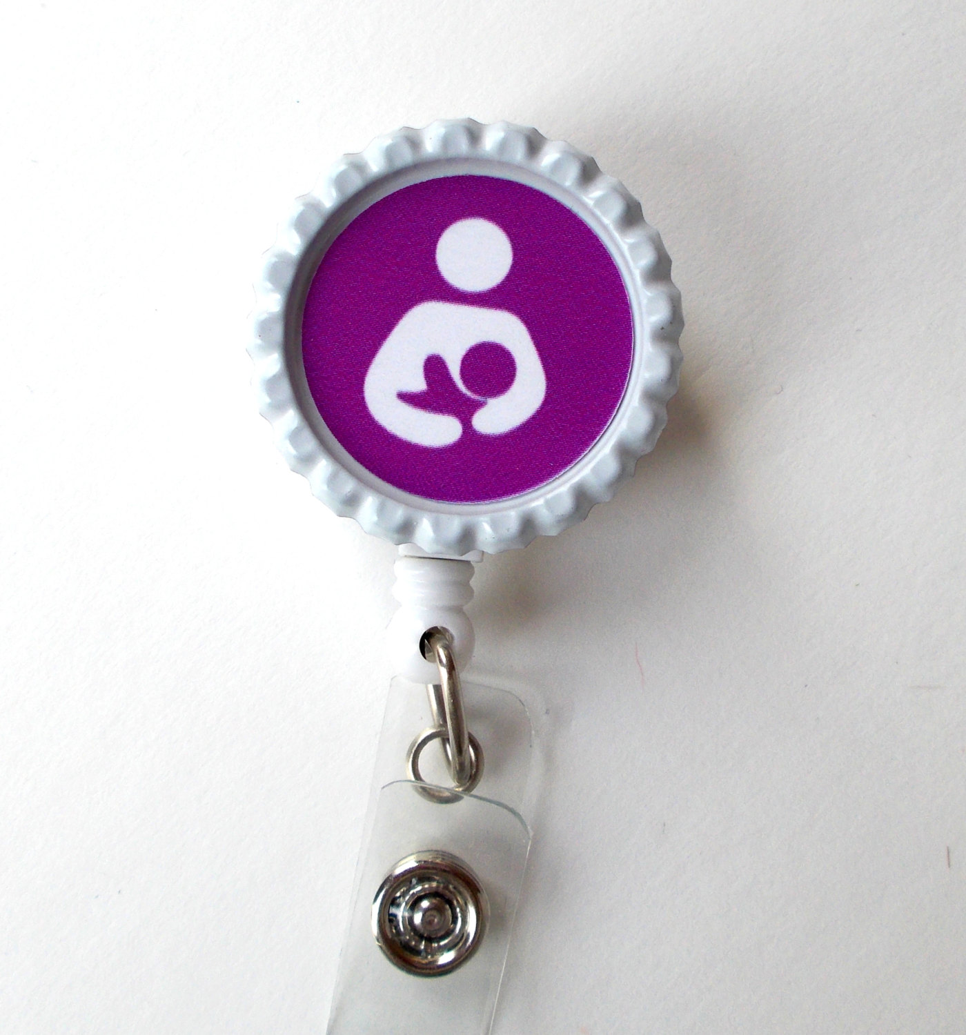 This retractable ID felt badge holder features a purple lactation specialist graphic. Graphic is sealed with an epoxy sealant. Graphic is glued to a white bottle cap. Sits on a white, hard plastic badge reel.