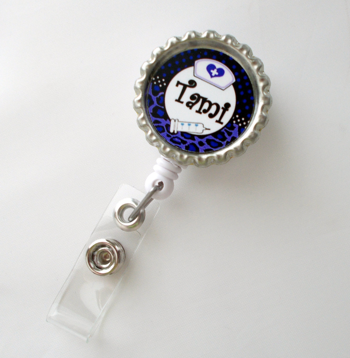 This badge can be personalized with your name or initials. It's purple with a nurse cap at the top and a syringe at the bottom. Graphic sits on a silver bottle cap. Graphic is sealed with an epoxy sealant. You may wipe the graphic with a damp cloth to clean it but it is not waterproof.