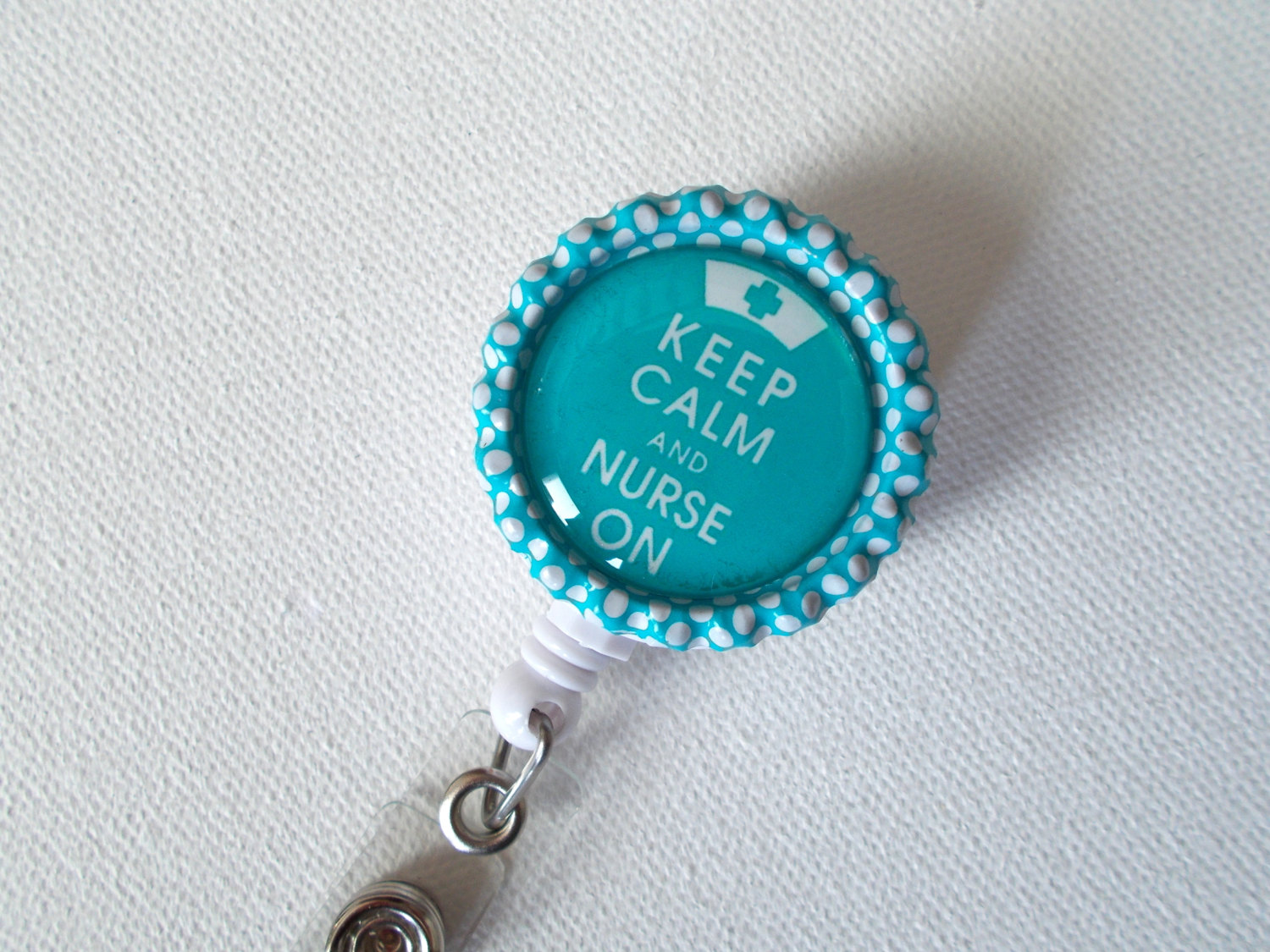 Keep Calm and Nurse On Blue - ID Badge holder set on a blue and white polka dot bottle cap. Super cute and sure to brighten your day!