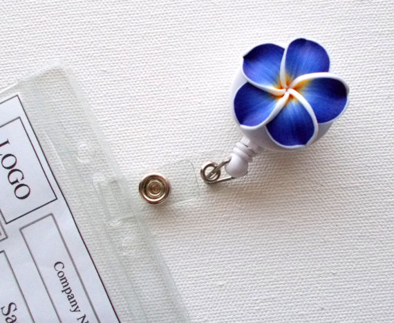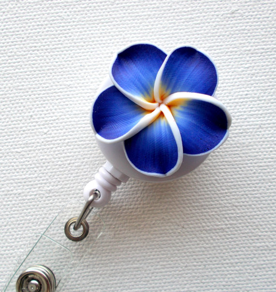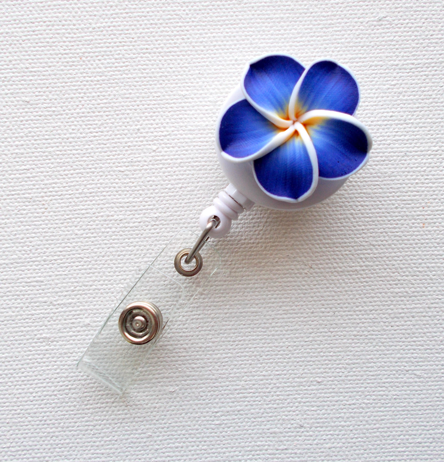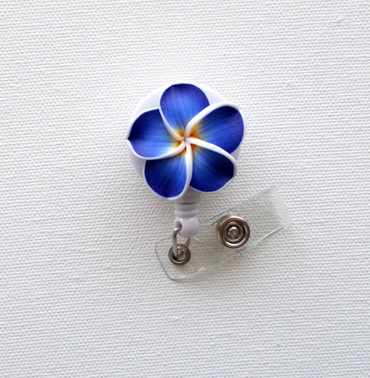 This badge features a royal blue plumeria polymer clay flower set on a white badge holder.