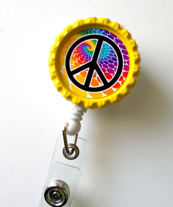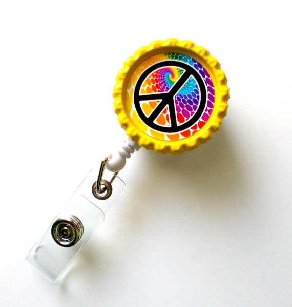 Groovy Peace Sign ID Badge holder set on a yellow bottle cap. Super cute and lots of color!